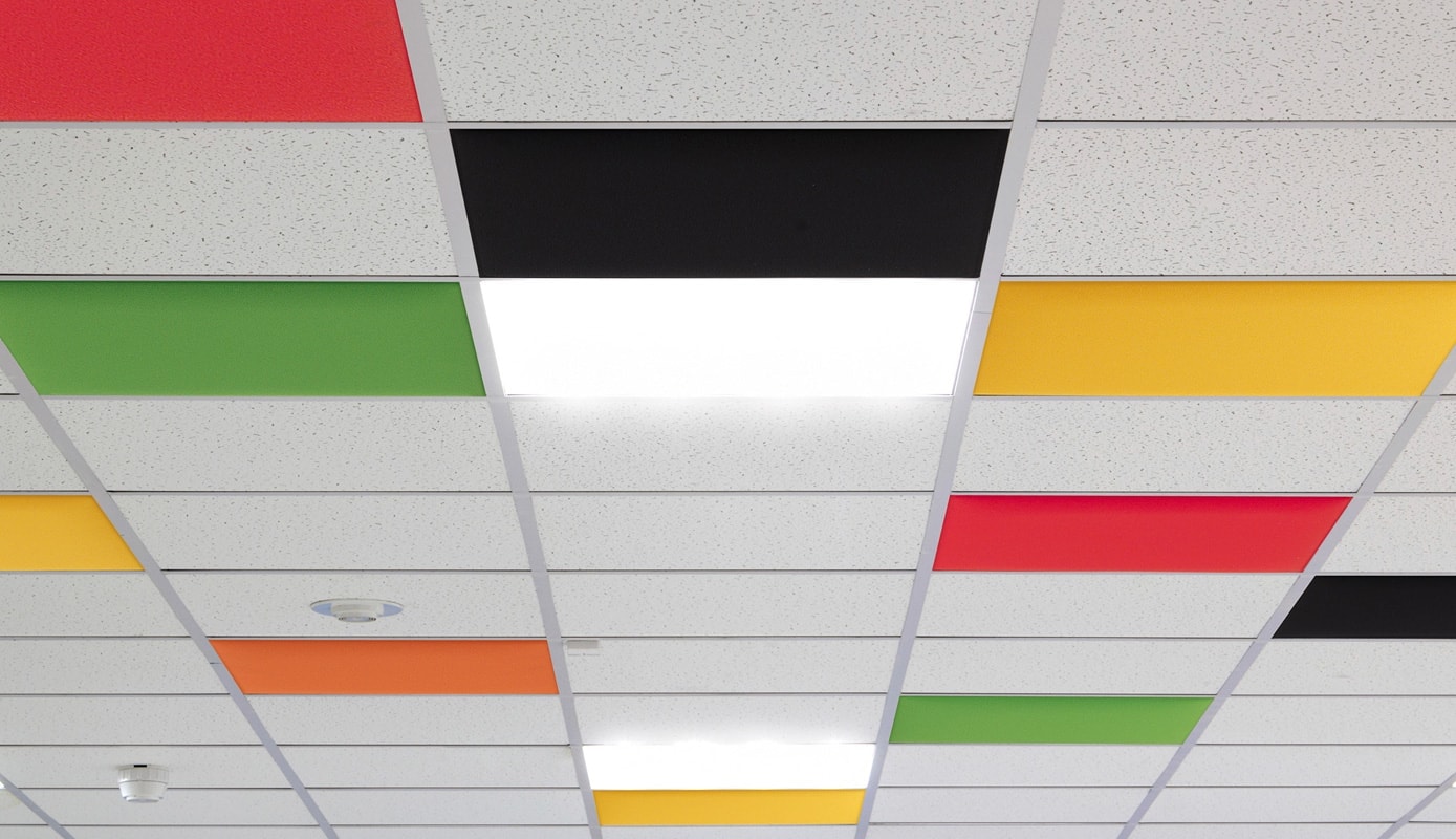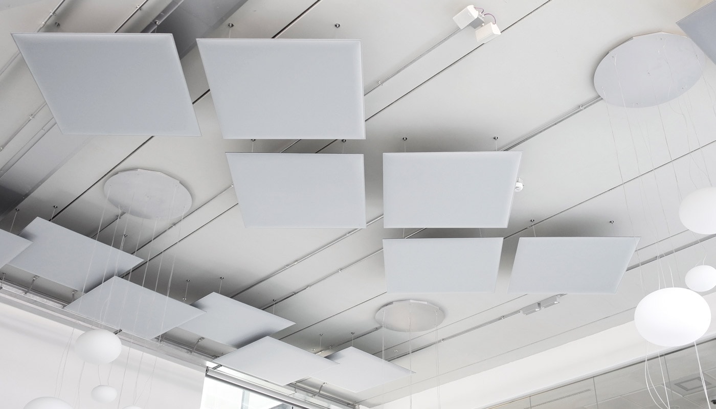 Per garantire comfort acustico senza intervenire sullo spazio a disposizione, Caimi propone anche il pannello acustico per controsoffitto IN, con moduli quadrati o rettangolari di colori diversi, e il pannello acustico a sospensione Oversize Ceiling, discreto ed elegante.