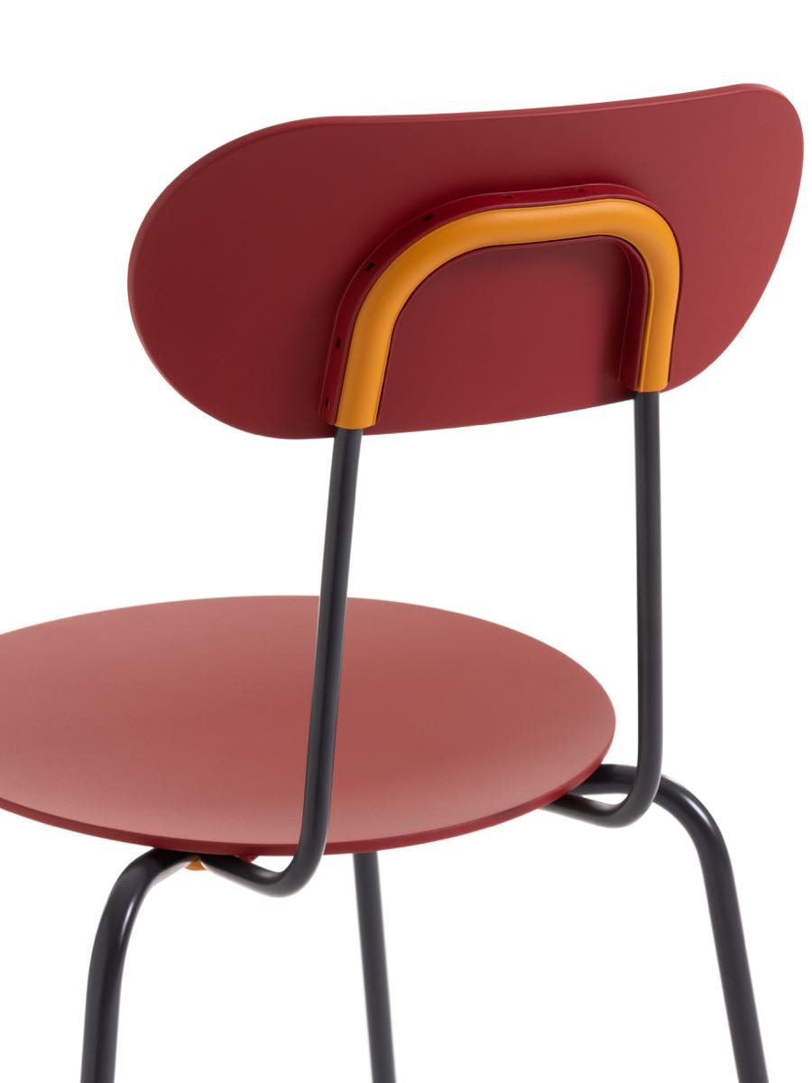 Le forme apparentemente semplici della sedia Mariolina nascondono, in realtà, dettagli di design che rendono la seduta estremamente confortevole. Per esempio, le gambe sottili e lo schienale curvo permettono una postura comoda, e sono fissati mediante nervature in polipropilene stampato agganciate alla struttura metallica, superando il tradizionale fissaggio con viti o rivetti.
