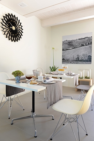 Per questo progetto abbiamo selezionato, tra gli altri arredi, sedie per esterno Vegetal e tavoli Contract Table.