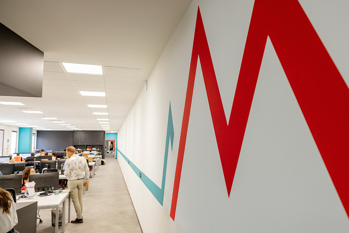 I nuovi uffici sono nati da un progetto ambizioso dello studio monovolume, che ha creato un elemento paesaggistico contemporaneo ispirato al tema del viaggio su strada. L’edificio pre-esistente e il nuovo sono legati da un nastro rosso, simbolo di una “corsia preferenziale rossa”, che richiama il concetto di corsia stradale.