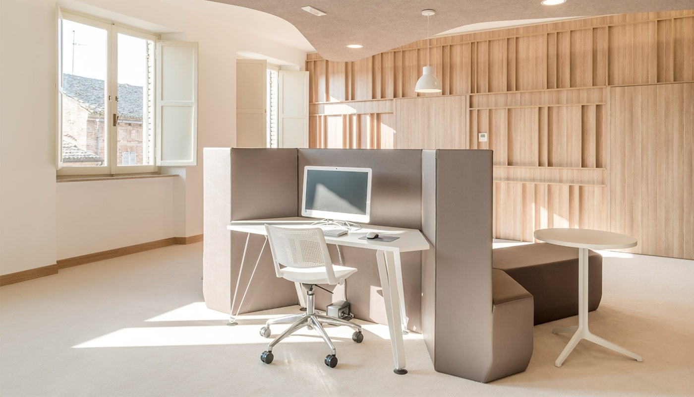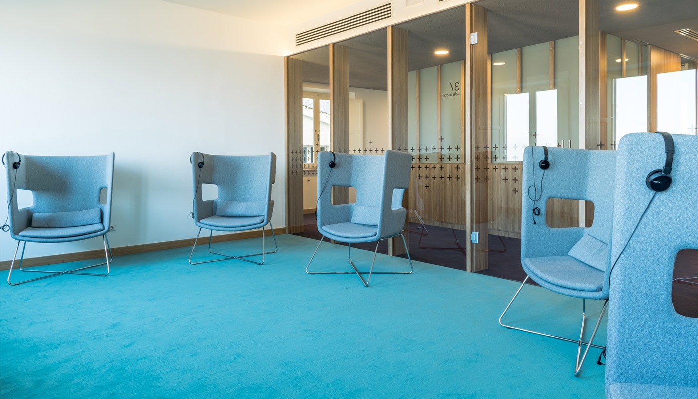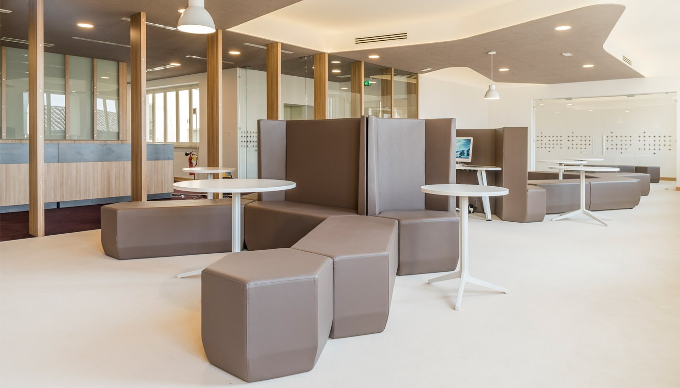 In questo progetto sono inclusi: seduta operatore Revolution, poltrone lounge Poppea soft, moduli sedute, panche e pannelli divisori custom.