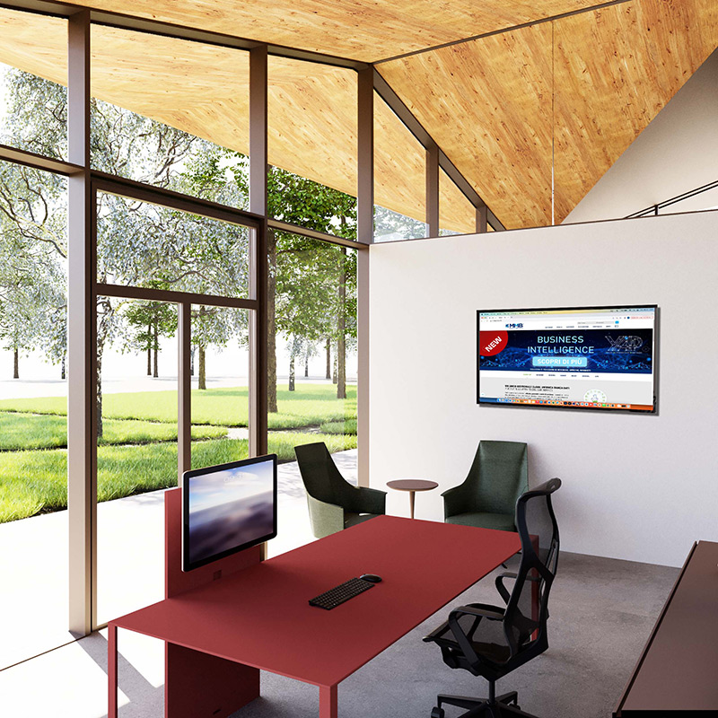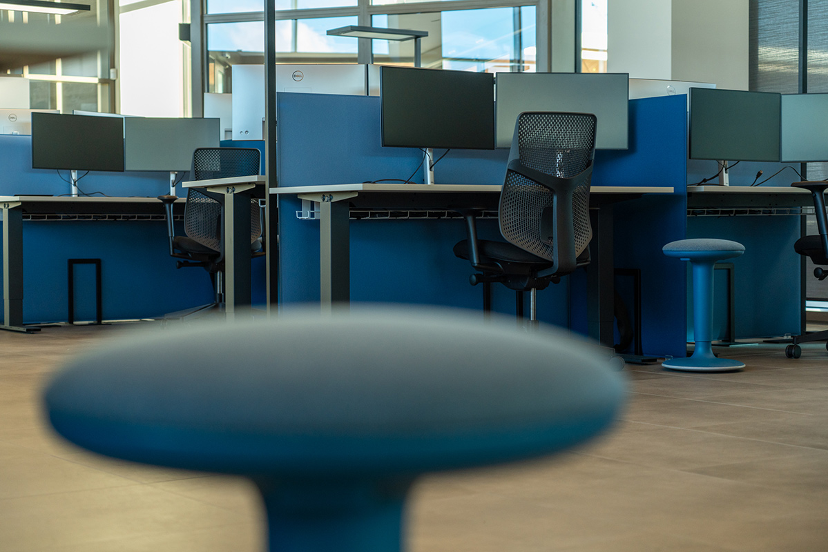 Per le postazioni operative, in particolare, abbiamo proposto scrivanie singole come alternativa ai modelli bench, dotate di un sistema di regolazione meccanica in altezza che le rende completamente indipendenti dall’impiantistica elettrica.