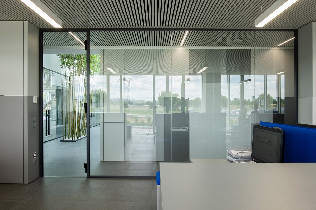 Per questo progetto, abbiamo realizzato vari arredi su progetto, tra cui: contenitori, tavoli espositivi con sgabelli, tavolo conferenza, banco accoglienza, blocco cucina, arredi per bagni, scrivanie operative BigBox com mobiletti integrati, su disegno, pareti e porte in vetro monolastra Slate, pareti divisorie in pannello e armadi Bild, sedute operative Blaze.
