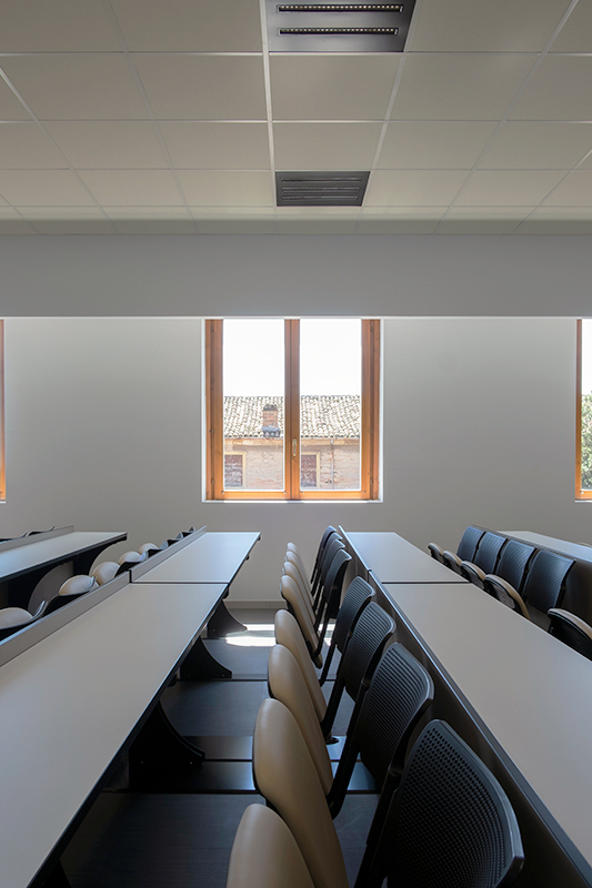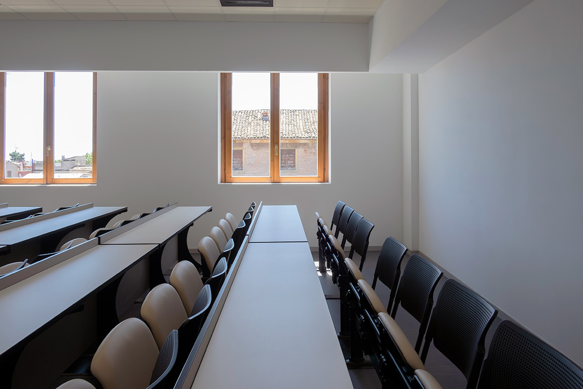 Nel cuore di Fano, lo storico Palazzo Marcolini – oggi sede di un campus universitario privato – è stato recentemente oggetto di un significativo intervento di ristrutturazione, a cui ha fatto seguito un progetto di allestimento degli spazi curato da Della Chiara.