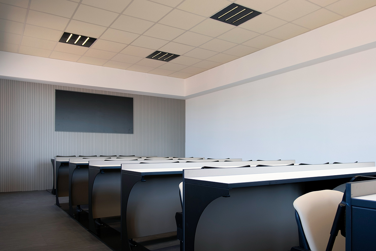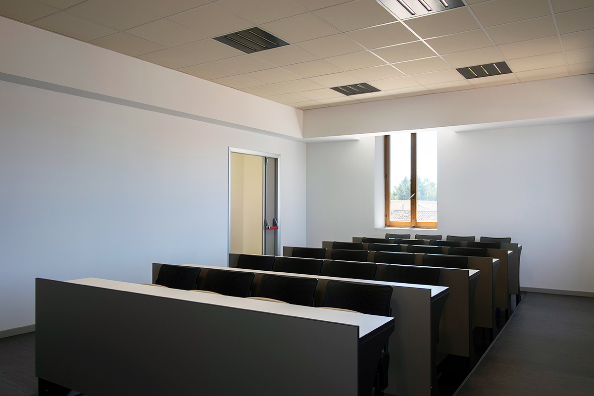 Obiettivo dell’intervento, la trasformazione dello spazio in aule di formazione moderne, funzionali e sostenibili, perfettamente integrate nel contesto architettonico esistente e conformi agli standard ergonomici per l’uso collettivo.