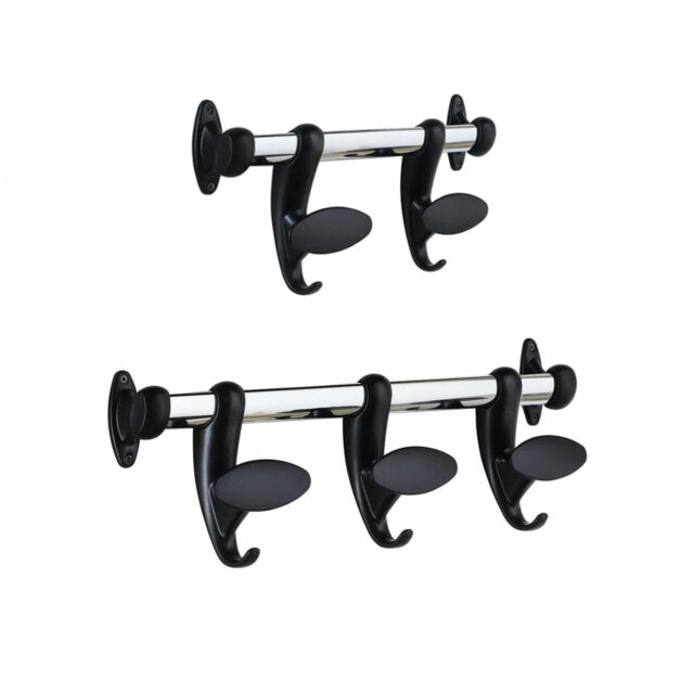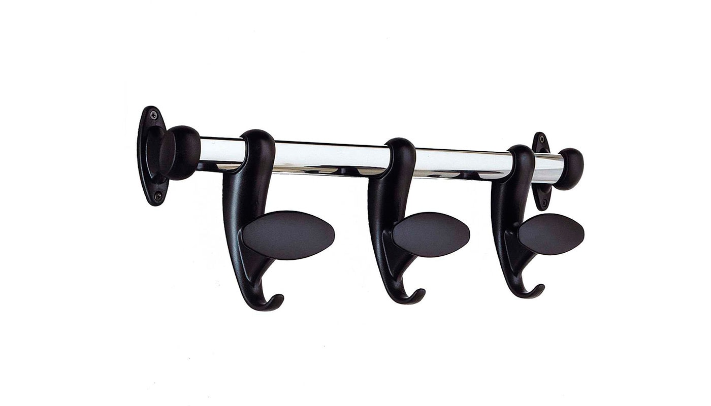 Hook è costituito da un tubo in acciaio cromato a sezione ellittica e da ganci in tecnopolimero nero o in policarbonato trasparente che possono essere lasciati liberi di scorrere lungo la barra oppure essere fissati mediante un’apposita vite posteriore.