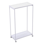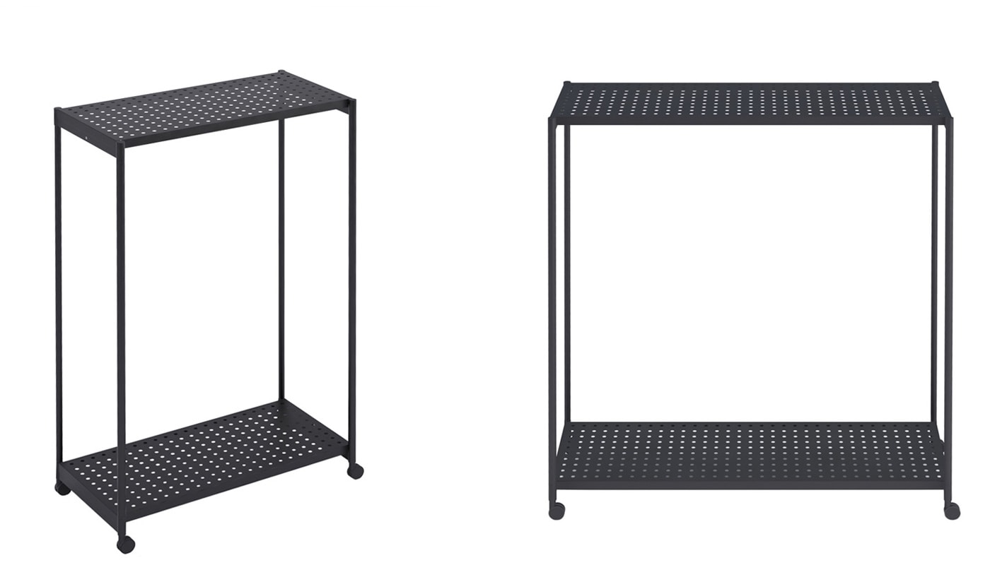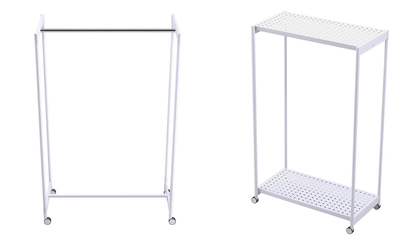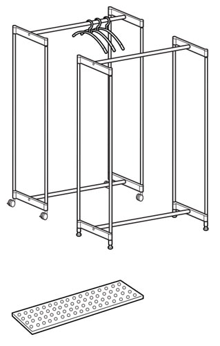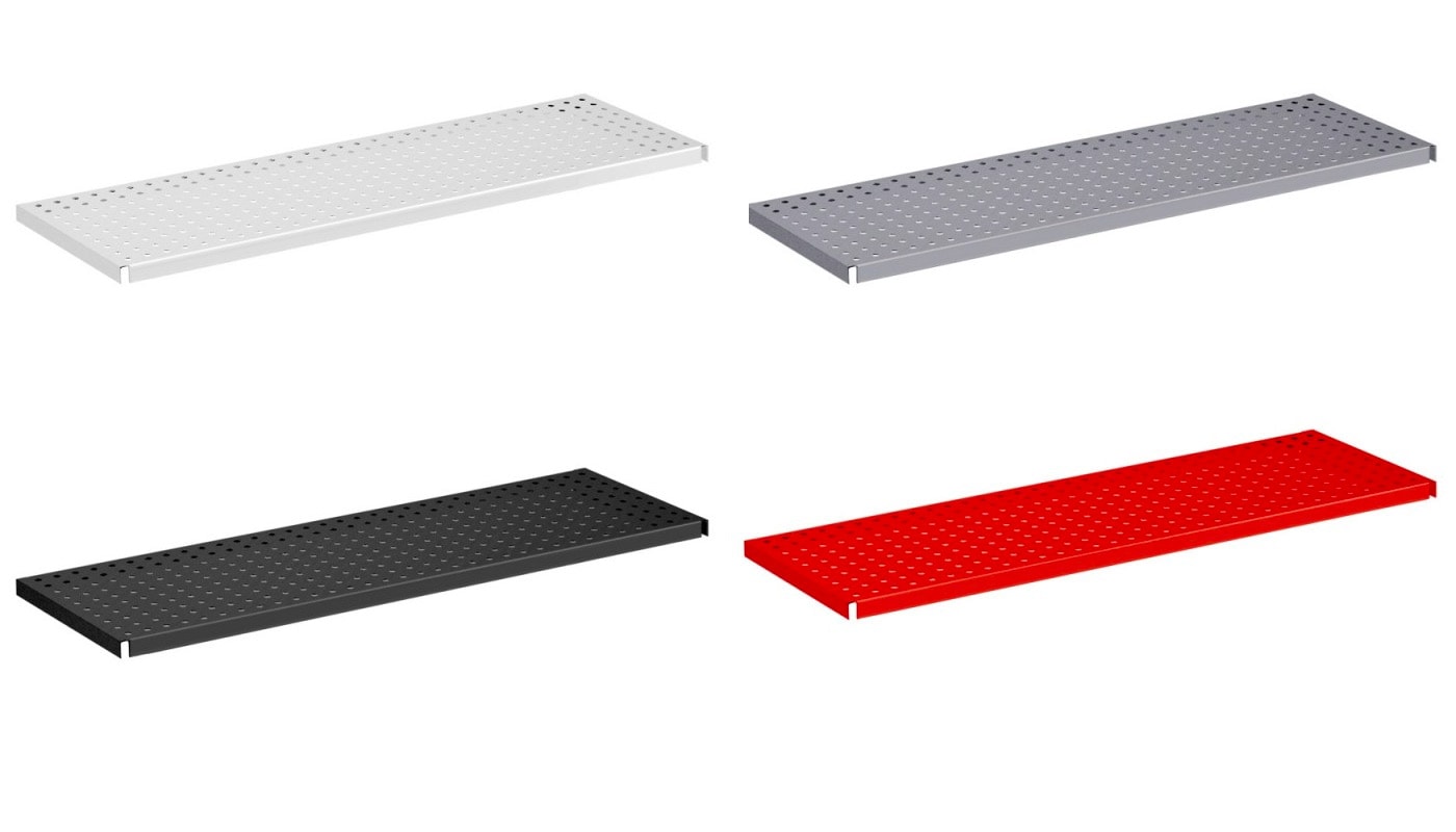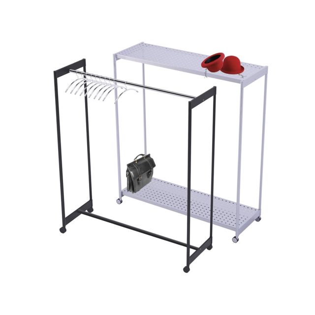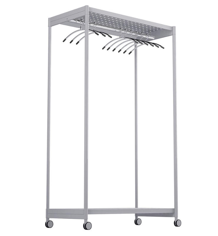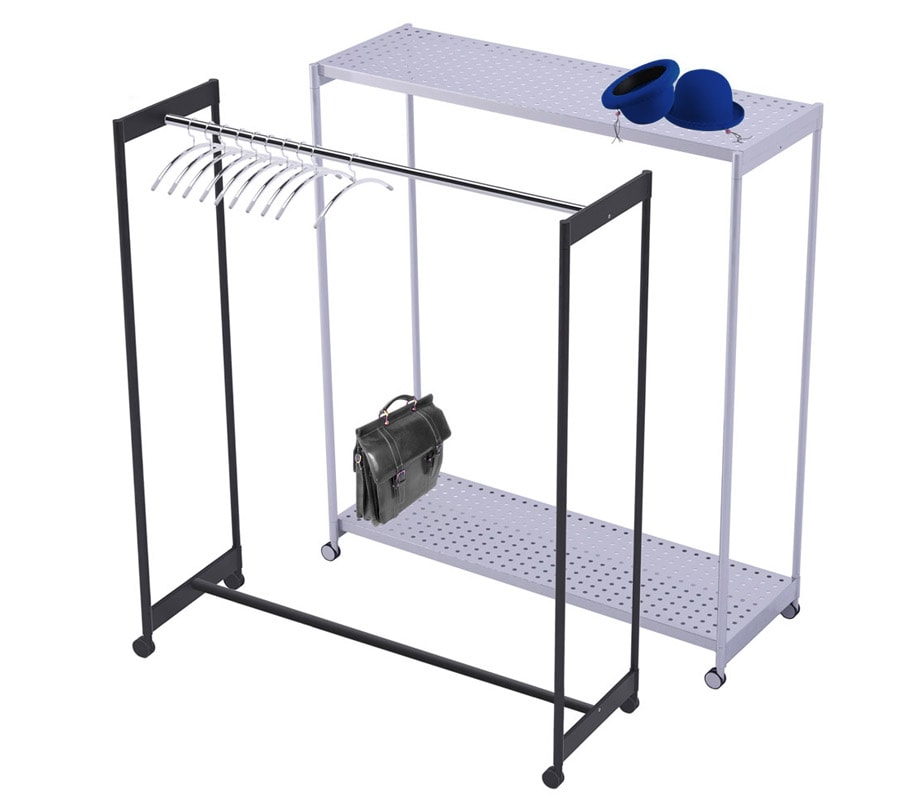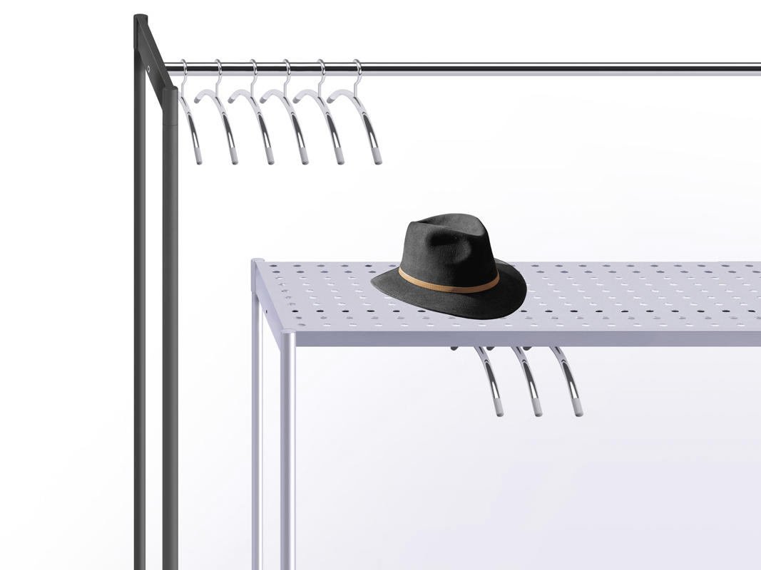 Meeting può essere configurato con uno o due piani di servizio opzionali traforati, ideali per appoggiare borse, cappelli o oggetti personali, oppure arricchito da un rivestimento in tessuto che lo trasforma in una funzionale cabina armadio.