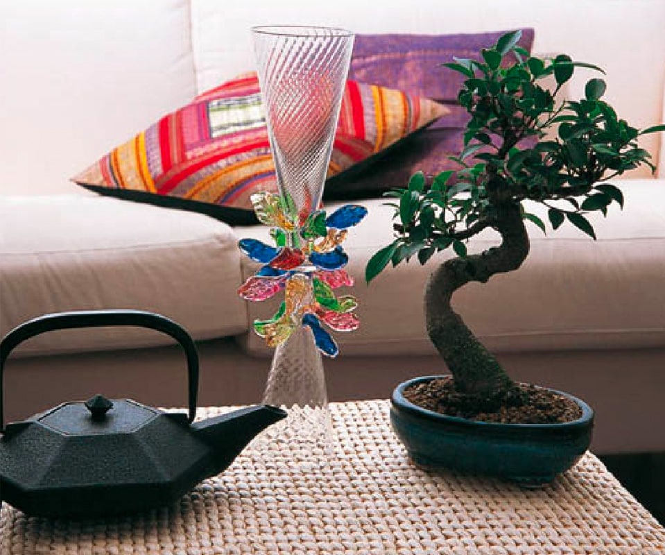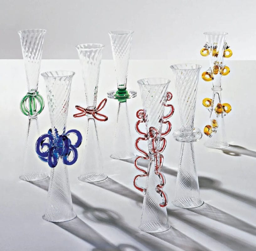 I bicchieri in vetro soffiato ideati per Driade da Borek Sipek sono campanule bifronti, attraversate da due motivi a diversa densità in alto e in basso, e legate al centro da strutture che rievocano ora un mondo vegetale cristallizzato in un’esplosione cromatica, come in Marina, ora una struttura astratta che ridonda su se stessa come in Bagatti Valsecchi, ora una formazione organica filiforme, dinamica e debordante, come in Bibi I.