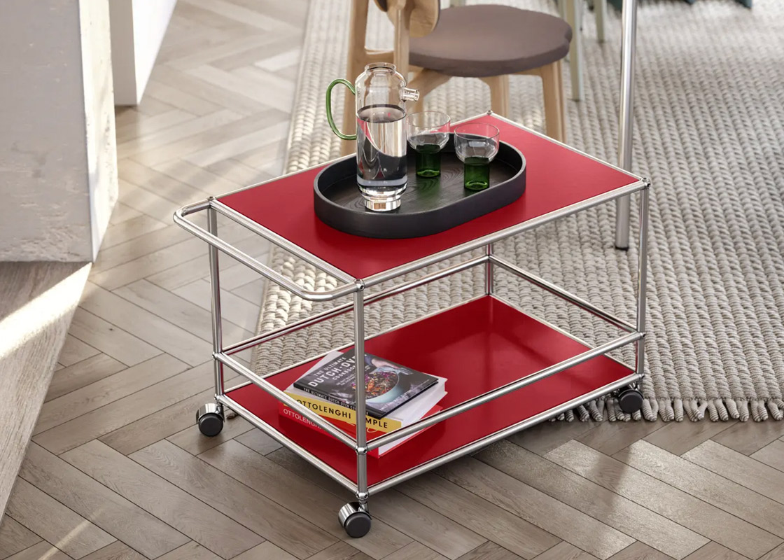 Il carrello su ruote Haller di USM, disponibile in una vasta gamma di colori, è il supporto ideale per la sala riunioni o l’area break.