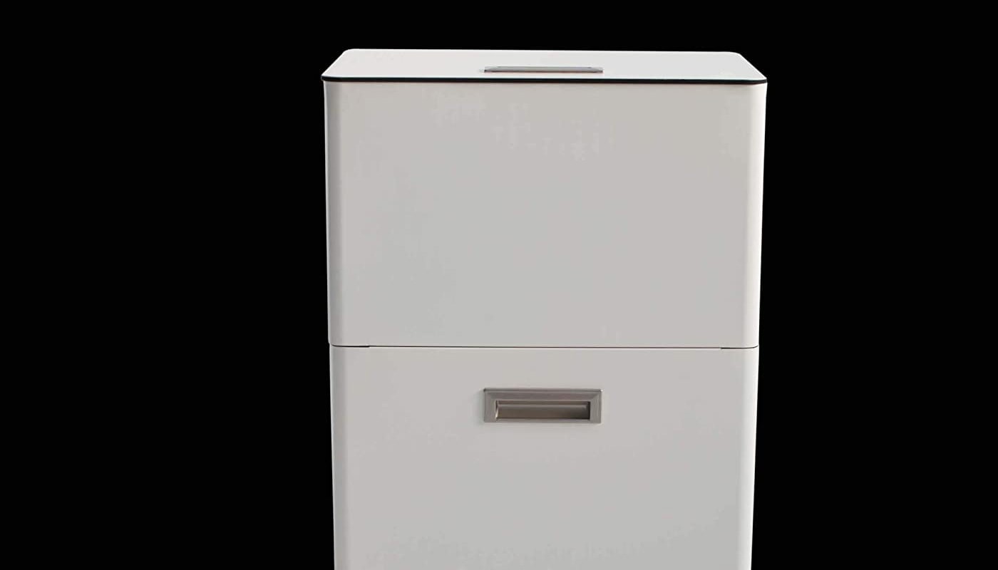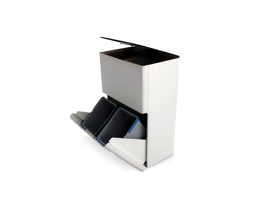 La pattumiera Four è realizzata in acciaio inox satinato o verniciato bianco. Al suo interno sono posti quattro secchi estraibili, ognuno della capacità di 18 litri, due sulla parte superiore chiusi da un coperchio incernierato e due nello scomparto frontale che si apre a ribalta.