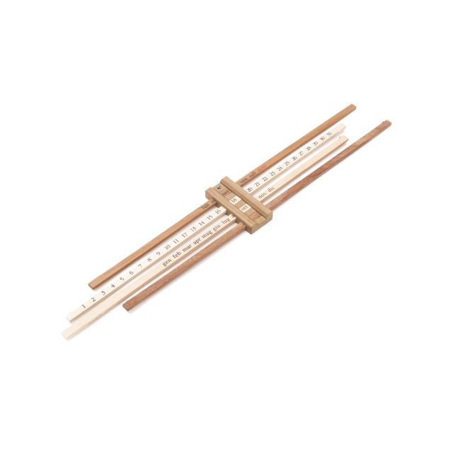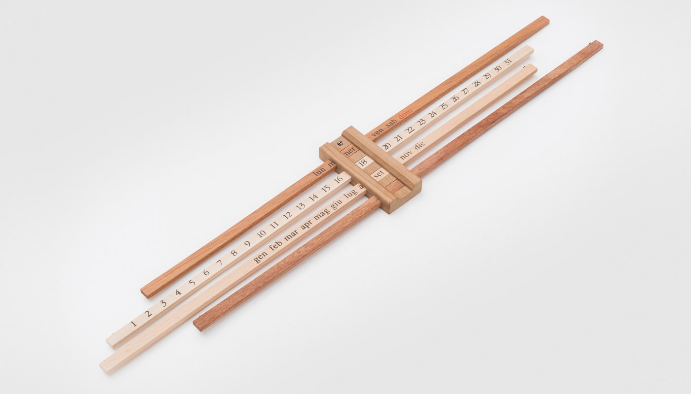 Il calendario è costituito da un perno centrale dove scorrono quattro liste di legno di diverse essenze in cui sono stampati numeri, giorni e mesi in italiano.