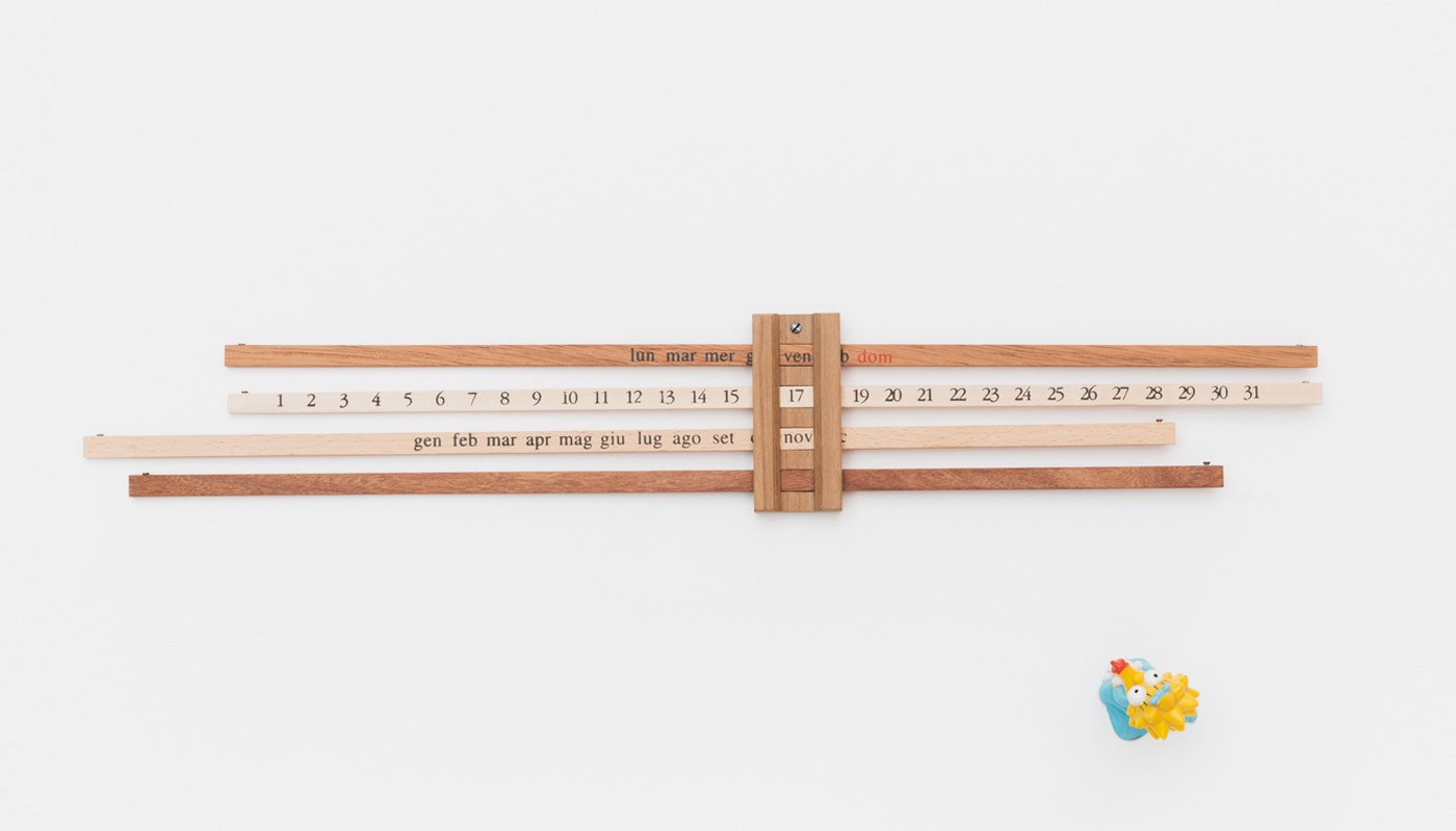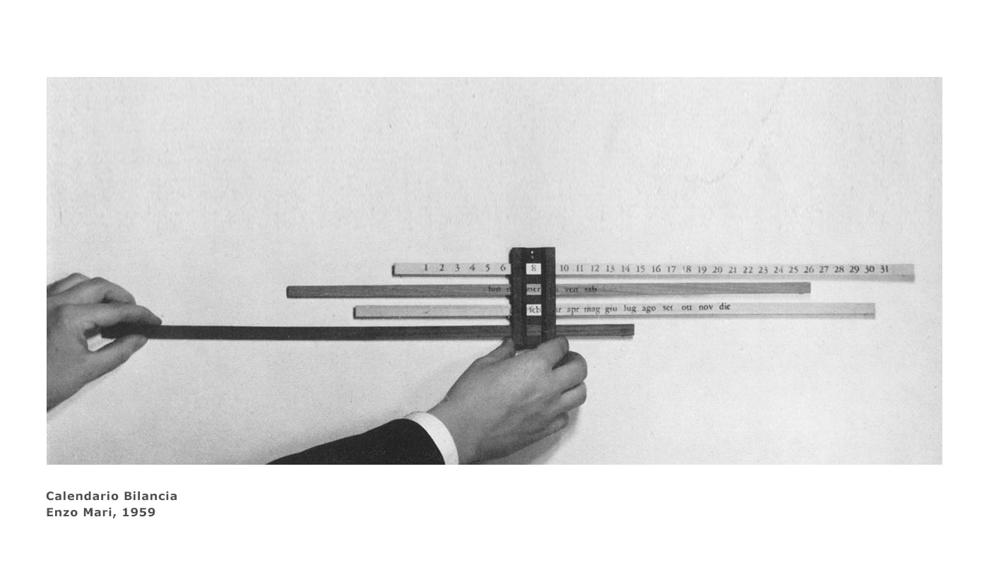 Calendario Bilancia di Danese, è un calendario da parete perpetuo in legno, disegnato da Enzo Mari nel 1959.