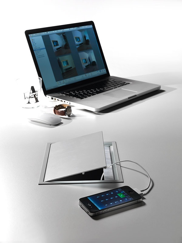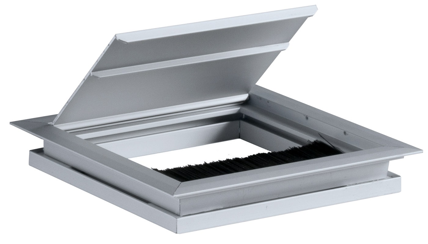 Exit di Della Chiara, con sportello basculante e spazzole in polipropilene, è un modulo passacavi realizzato in alluminio anodizzato.
