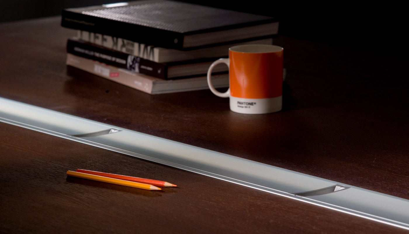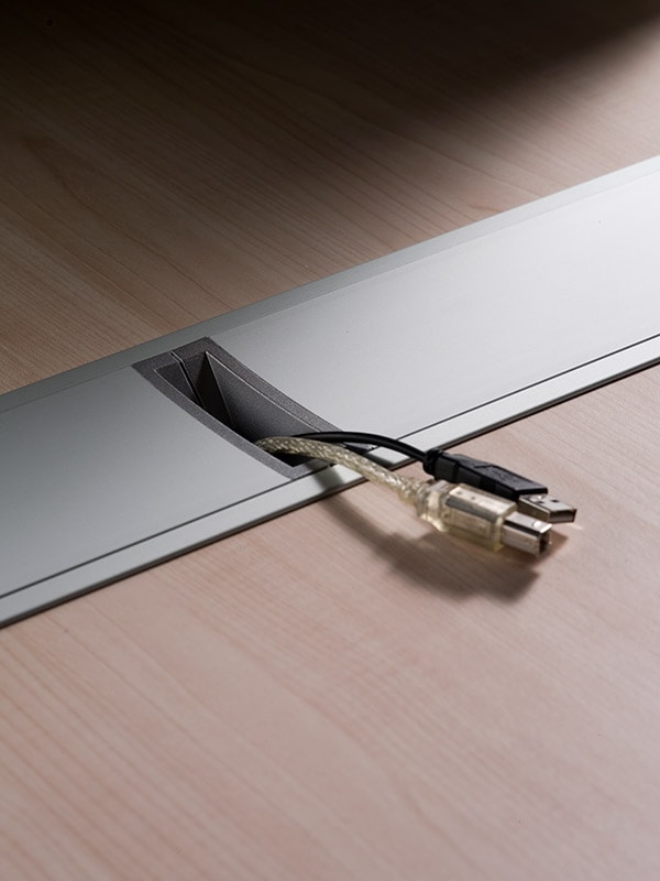Top Access di Della Chiara è un sistema passacavi dal design pulito che prevede l’uscita cavi alle estremità o in posizioni intermedie.