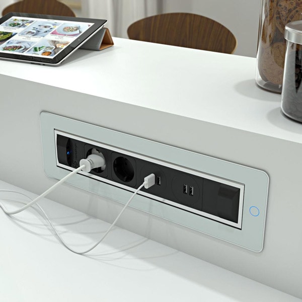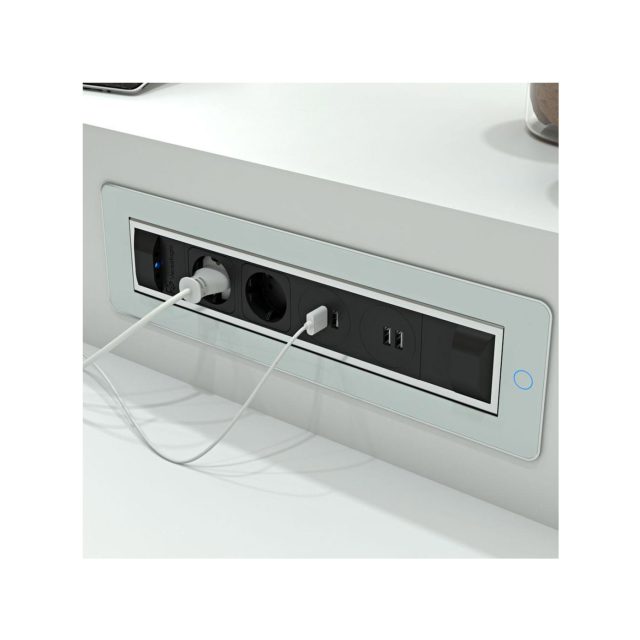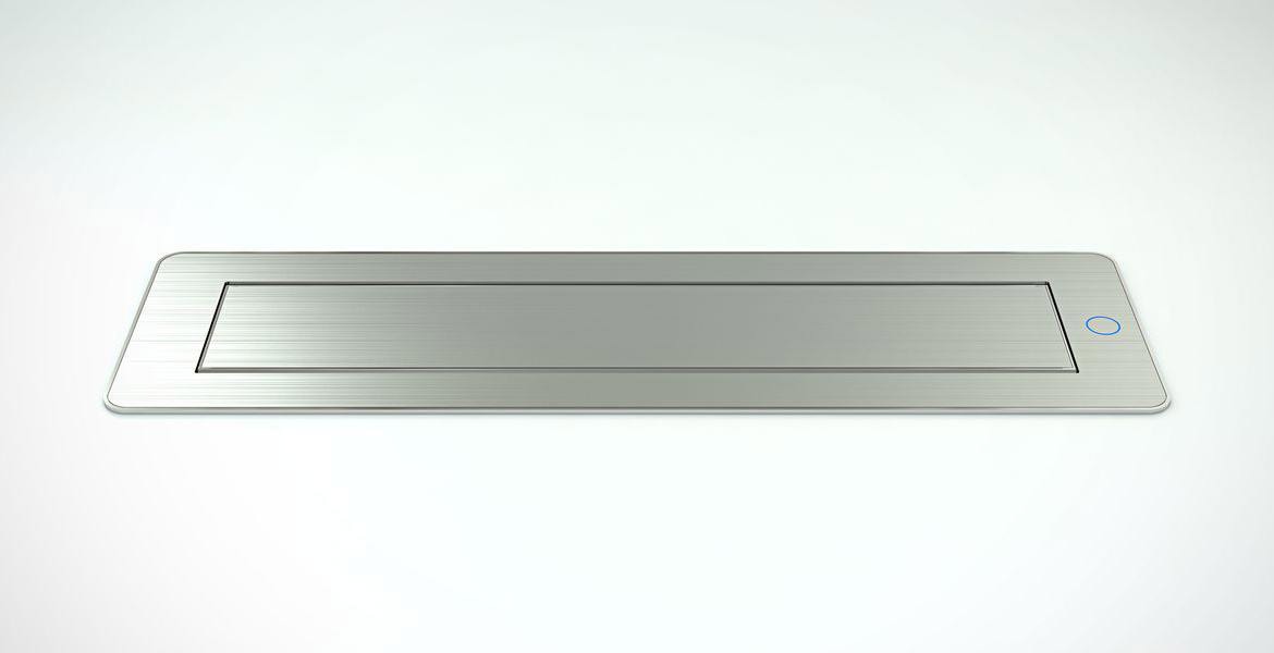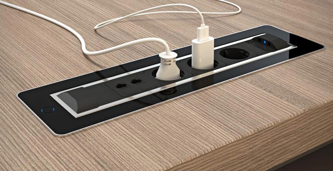 Versaturn di Della Chiara è una multipresa a scomparsa per l’attacco di cavi elettrici e cavi dati, con sistema touch di chiusura elettrico.