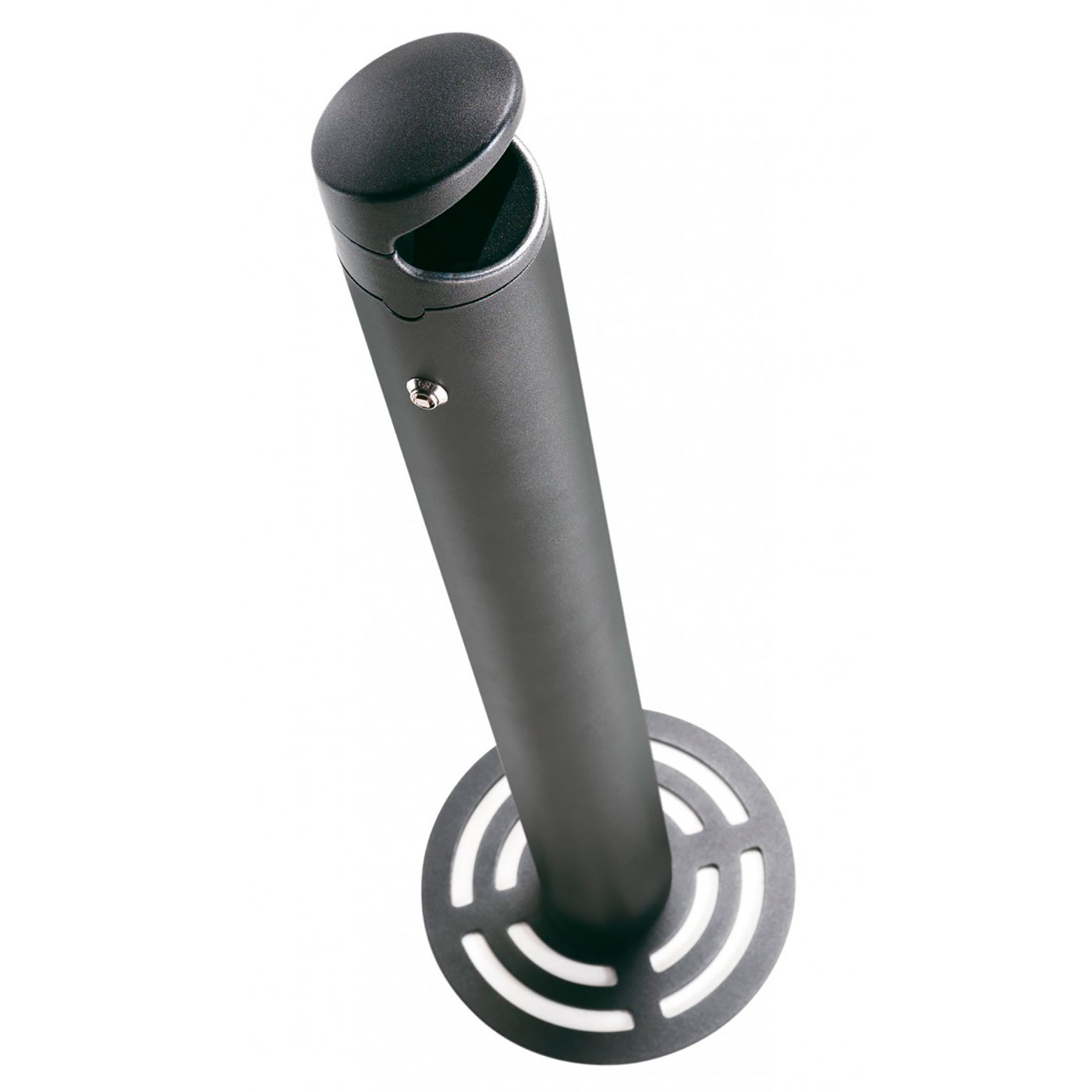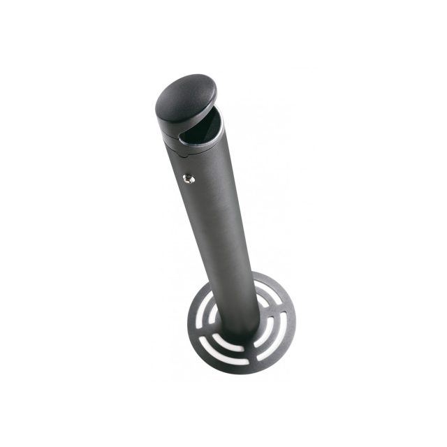 La struttura a colonna del posacenere Externo di Caimi, dalle linee pulite e proporzioni equilibrate, integra una base autoportante in acciaio zincato e un corpo in alluminio estruso verniciato a polveri epossidiche, resistente agli agenti atmosferici e ai segni del tempo.