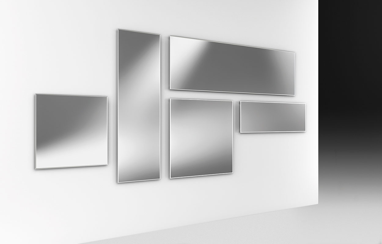 Lo specchio Mirage di Fiam si presta alla creazione di composizioni parietali di impatto grazie alla possibilità di abbinare fra loro forme quadrate e rettangolari di dimensioni differenti e personalizzabili, e si distingue per la retrocornice rientrante in alluminio.