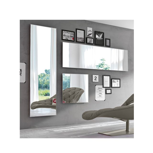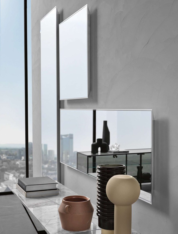 La retrocornice in alluminio brill, ad angolo rientrante, gioca sulle tre dimensioni producendo un seducente effetto di distacco dallo sfondo, e la possibilità di personalizzare le misure consente la creazione di composizioni d’arredo di grande potenza visiva.