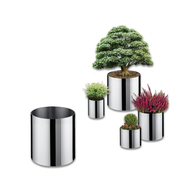Il design pulito ed essenziale delle fioriere Naxos, in acciaio lucido o satinato, si armonizza con ogni stile di arredo e valorizza il verde nella tua abitazione.