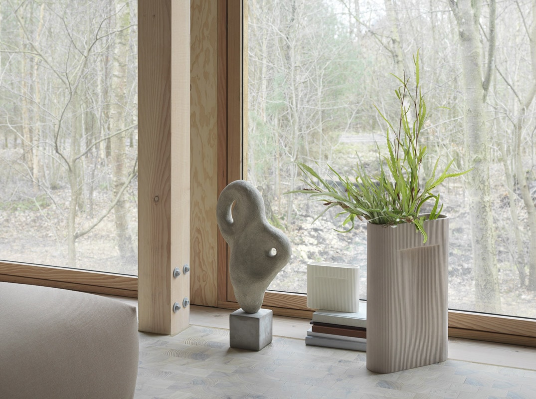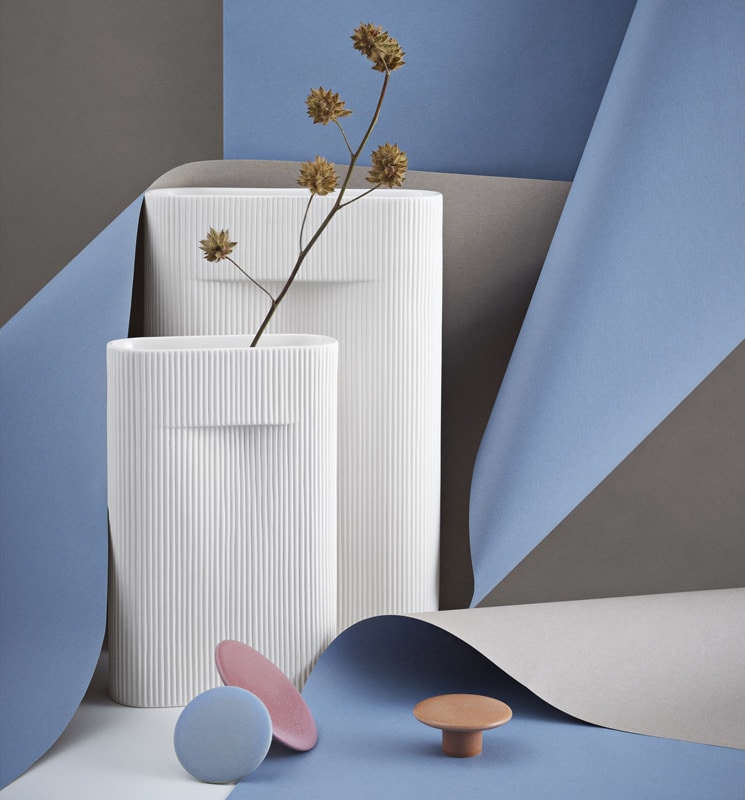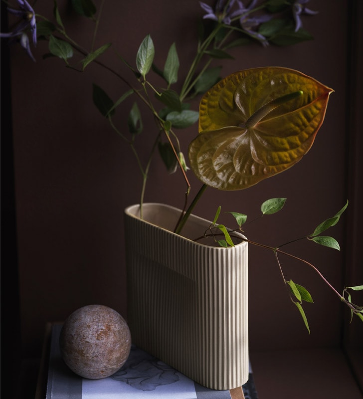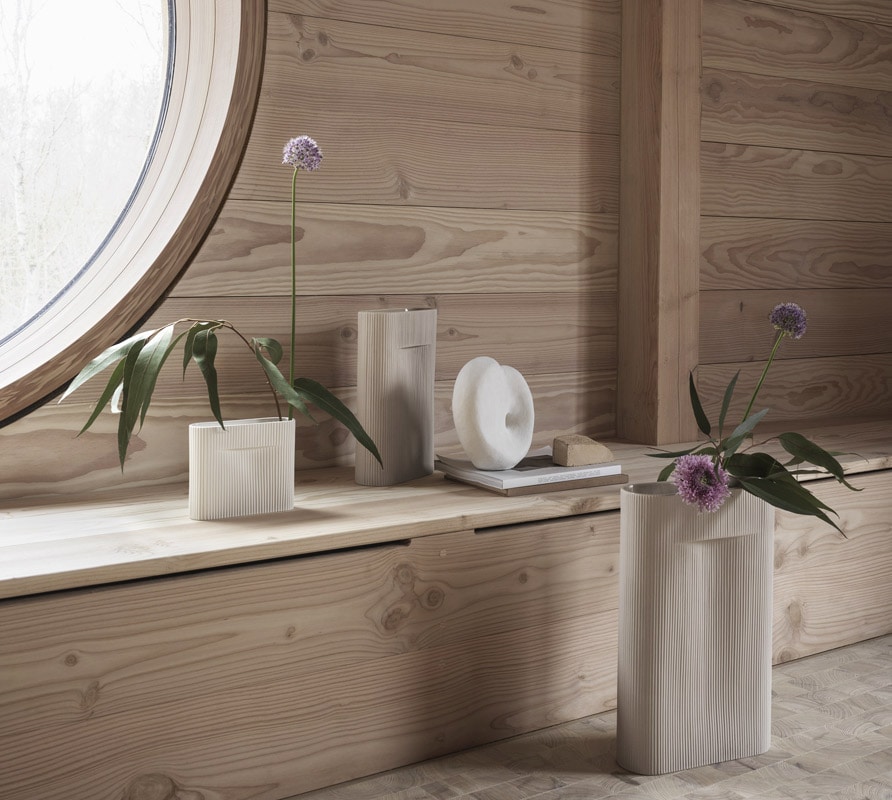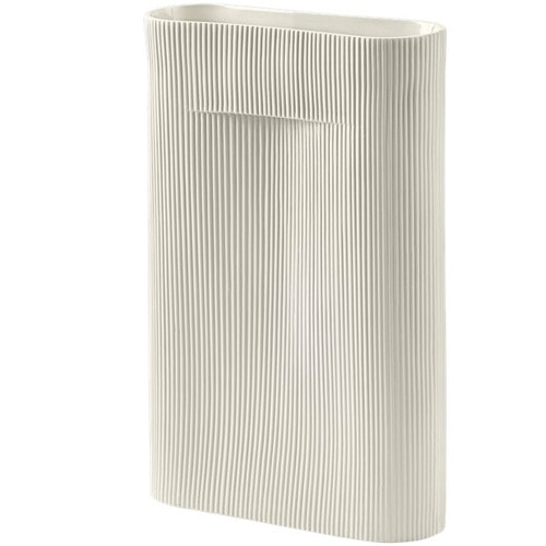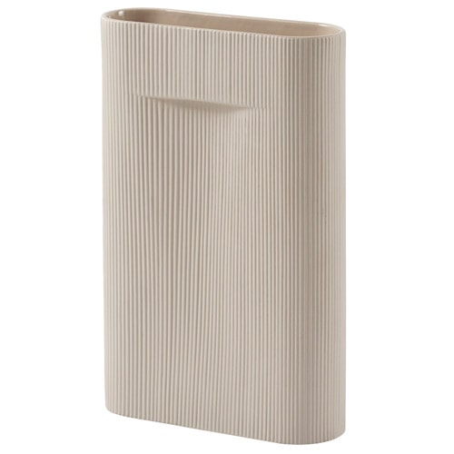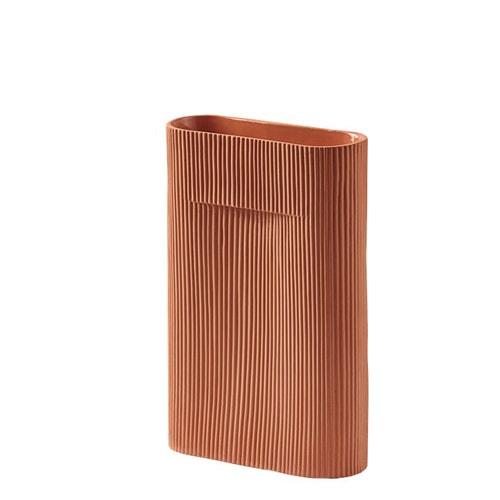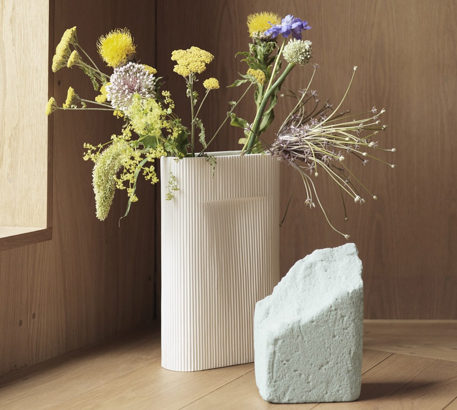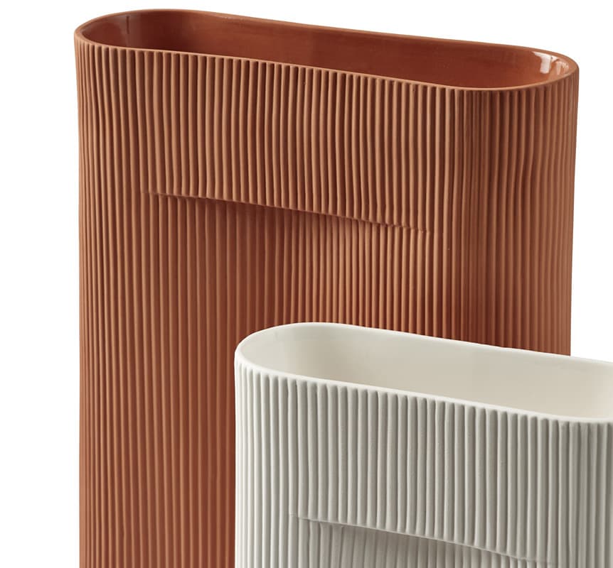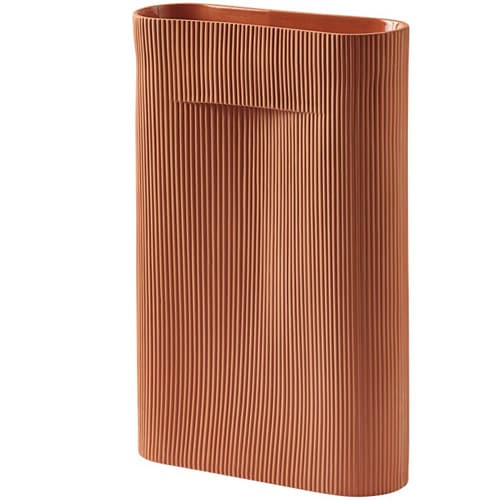 Il vaso portafiori Ridge Vase, pur nella semplicità del suo design, è un oggetto decorativo estremamente funzionale: la superficie ovale con righe verticali presenta infatti un piccolo dente, una sorta di “maniglia” per spostare agevolmente il vaso da una stanza all’altra.