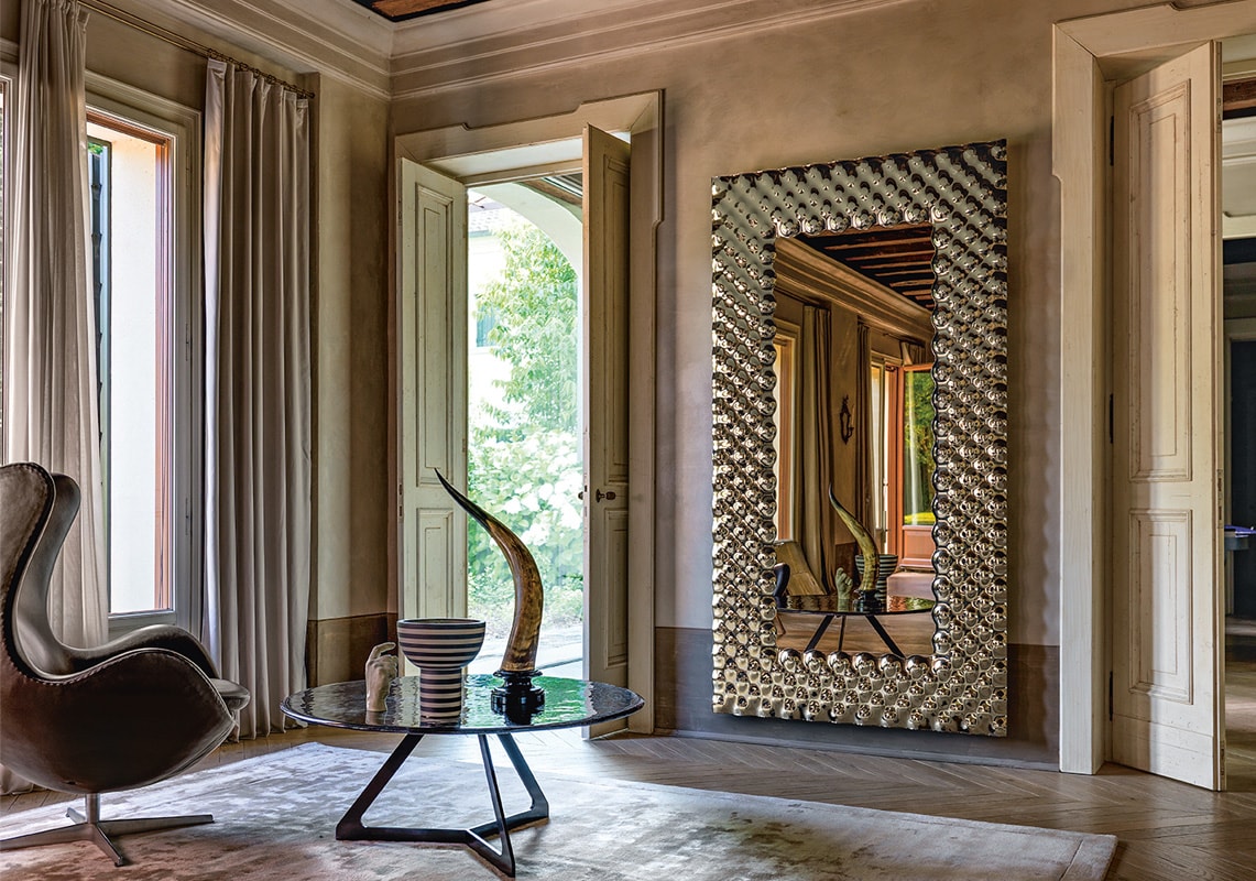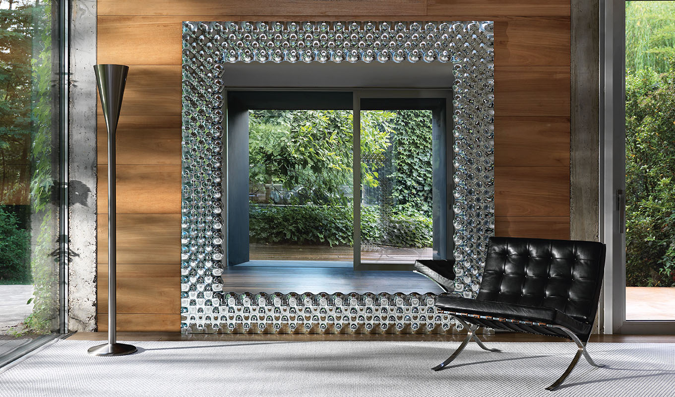 L’elegantissimo specchio Pop di Fiam si staglia con forza grazie alla sua ammaliante cornice in vetro fuso a gran fuoco.