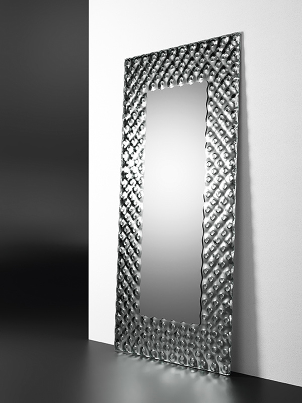 L’elegantissimo specchio Pop di Fiam si staglia con forza grazie alla sua ammaliante cornice in vetro fuso a gran fuoco.