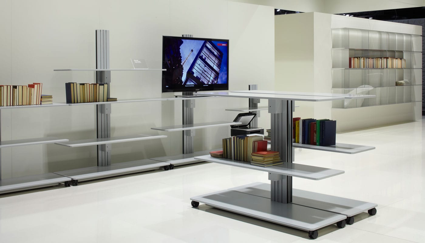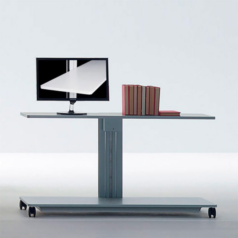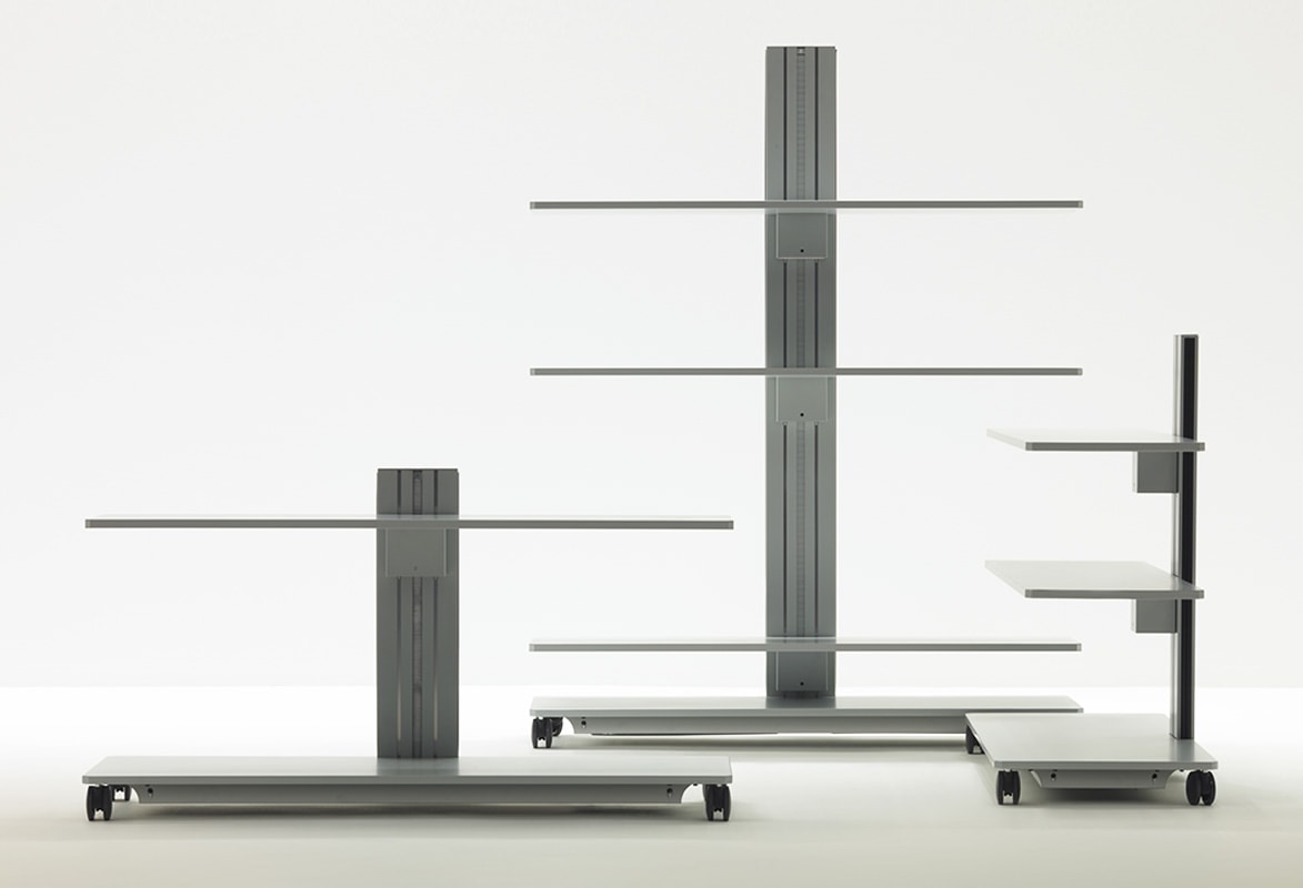 Move 010 di UniFor, ad opera dei designer Pagani e Perversi, è un carrello su ruote per postazioni multimediali, con piani regolabili e struttura provvista di passaggi per i cavi.