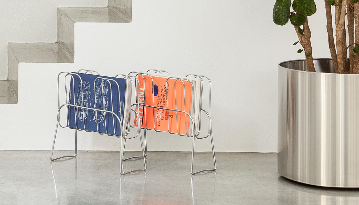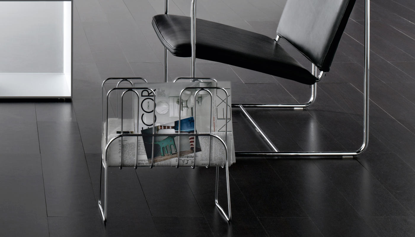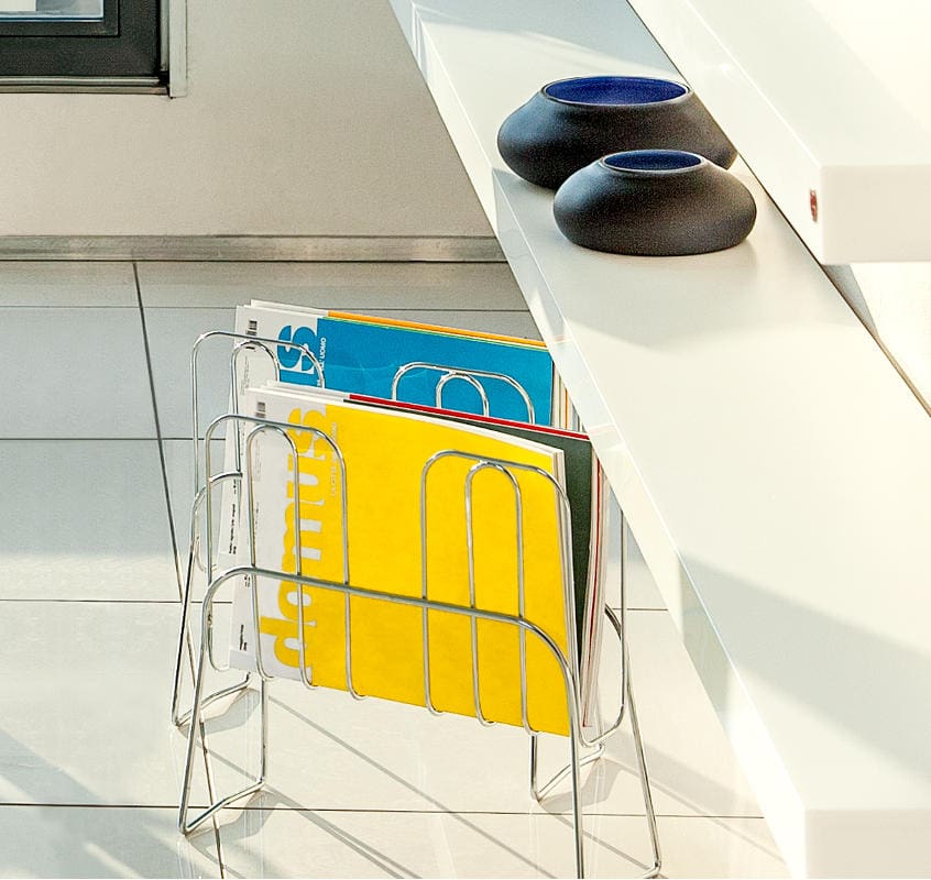 Uno stile essenziale e minimalista contraddistingue Press portariviste di Rexite che vanta la prestigiosa firma di Enzo Mari.