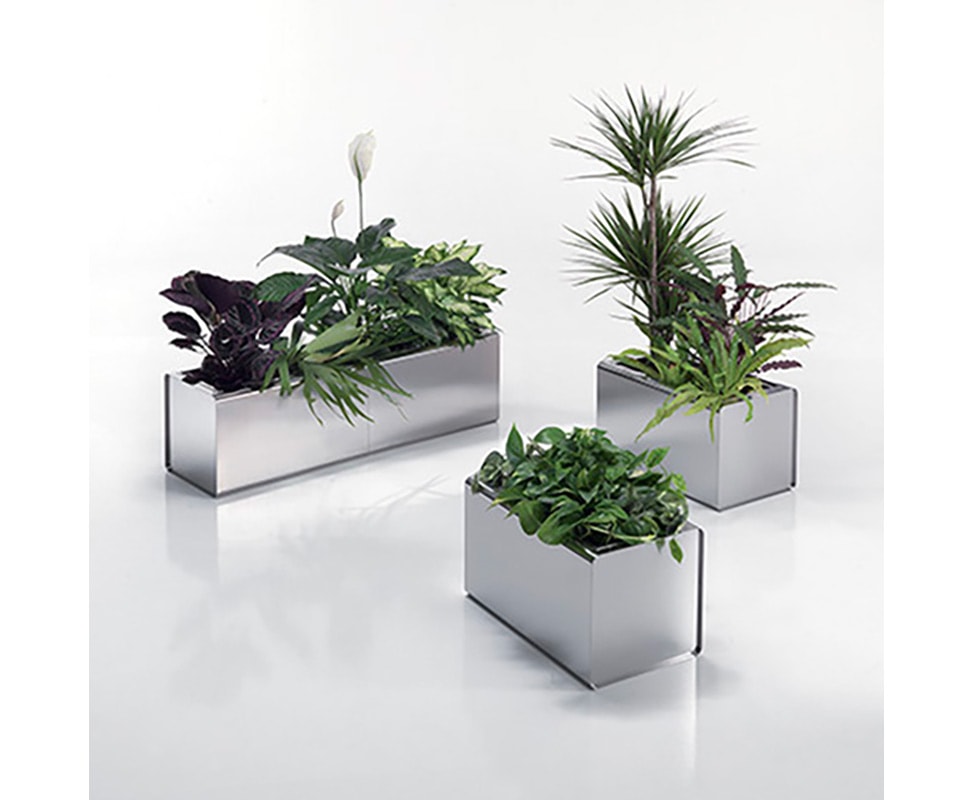 Prisma di Caimi è una serie di fioriere in acciaio inossidabile satinato, caratterizzata da una solida forma geometrica con bordi arrotondati antiurto e antinfortunio.