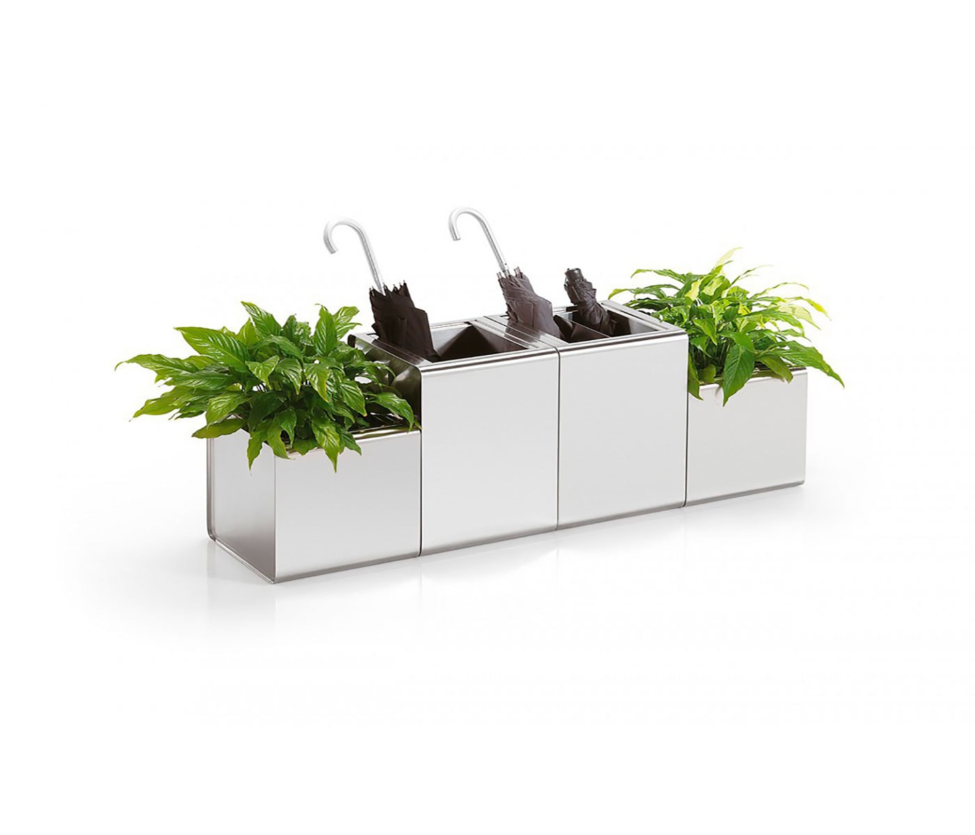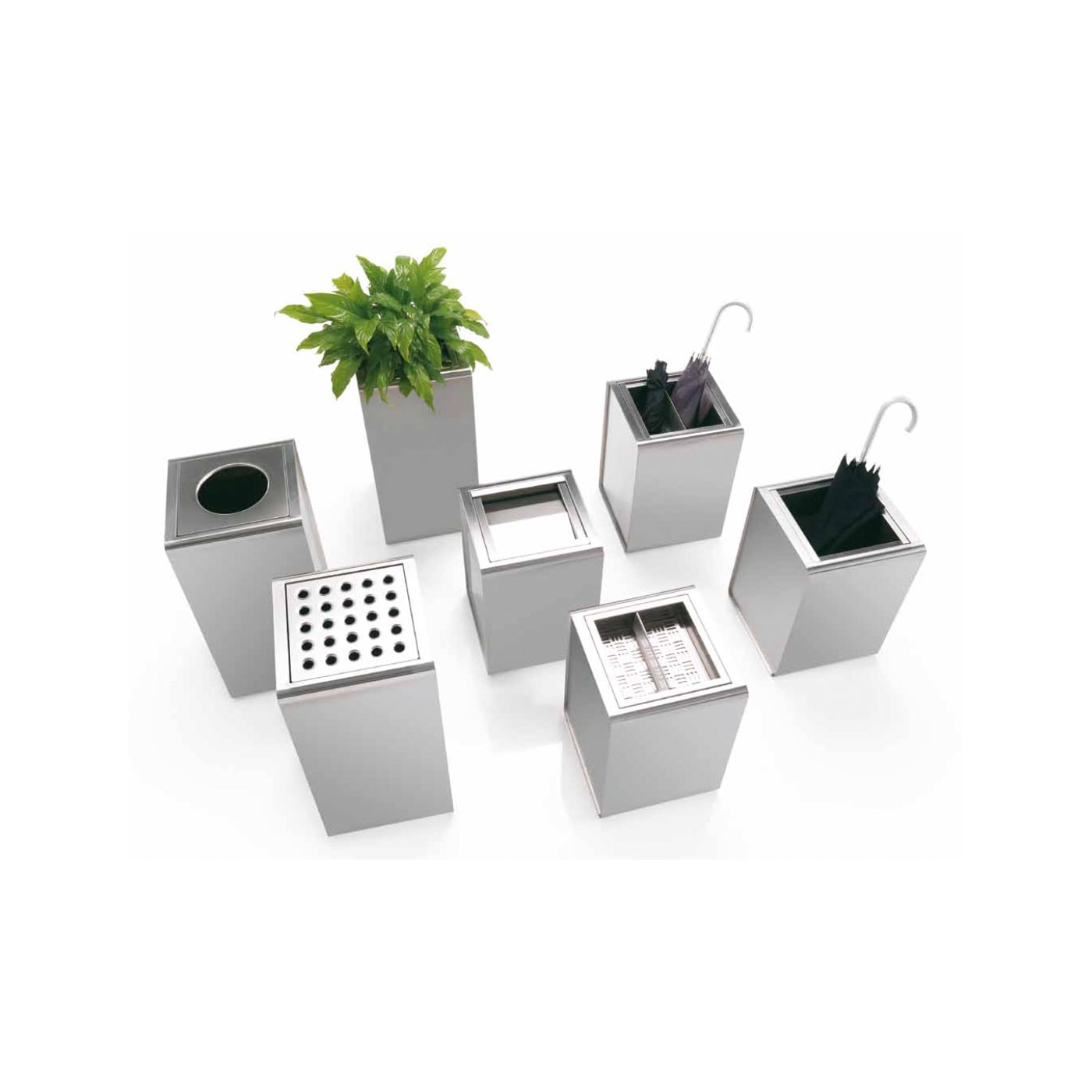 La serie comprende fioriere, portaombrelli, posacenere e cestini gettacarte, tutti disponibili anche in una variante realizzata per gli ambienti esterni.