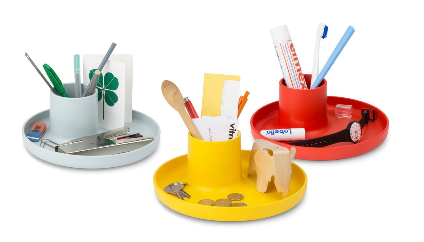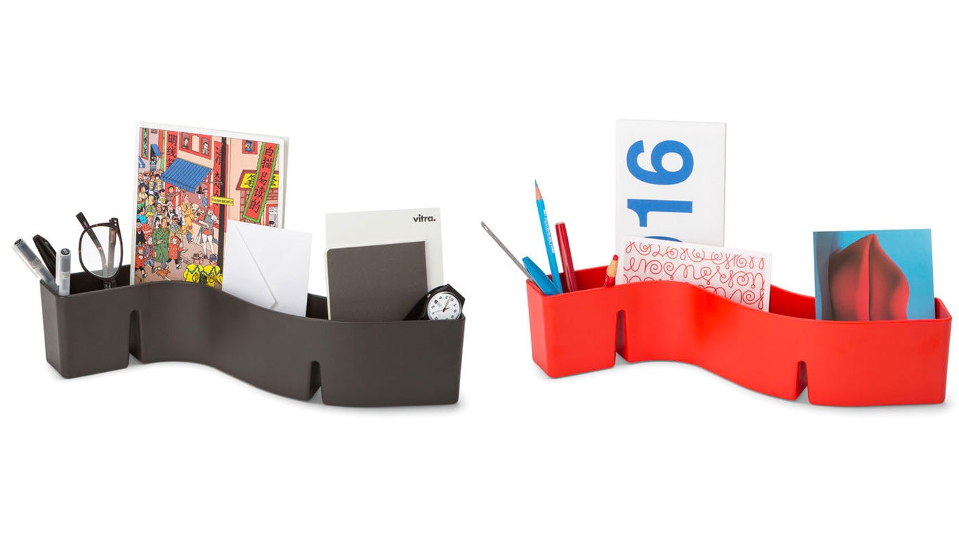 S-Tidy e O-Tidy portaoggetti, due contenitori da scrivania dalle linee morbide e dal sapore pop, disegnati da Michel Charlot per Vitra: O-Tidy è un portapenne innestato su un vassoio, S-Tidy un portaoggetti dalla caratteristica forma a serpentina.