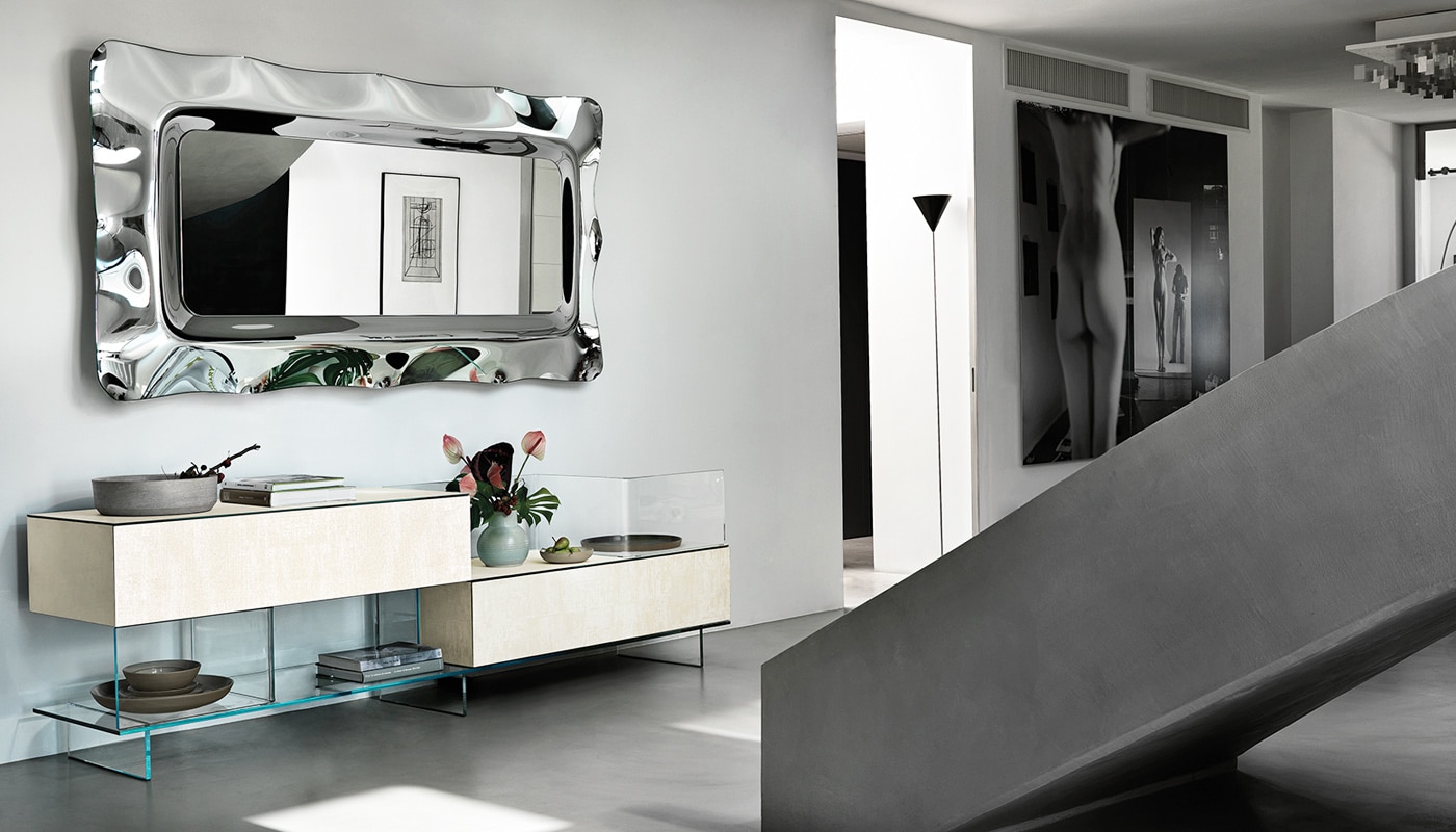 Uno specchio che emerge dal magma della sua cornice in vetro fuso, Dorian di Fiam.