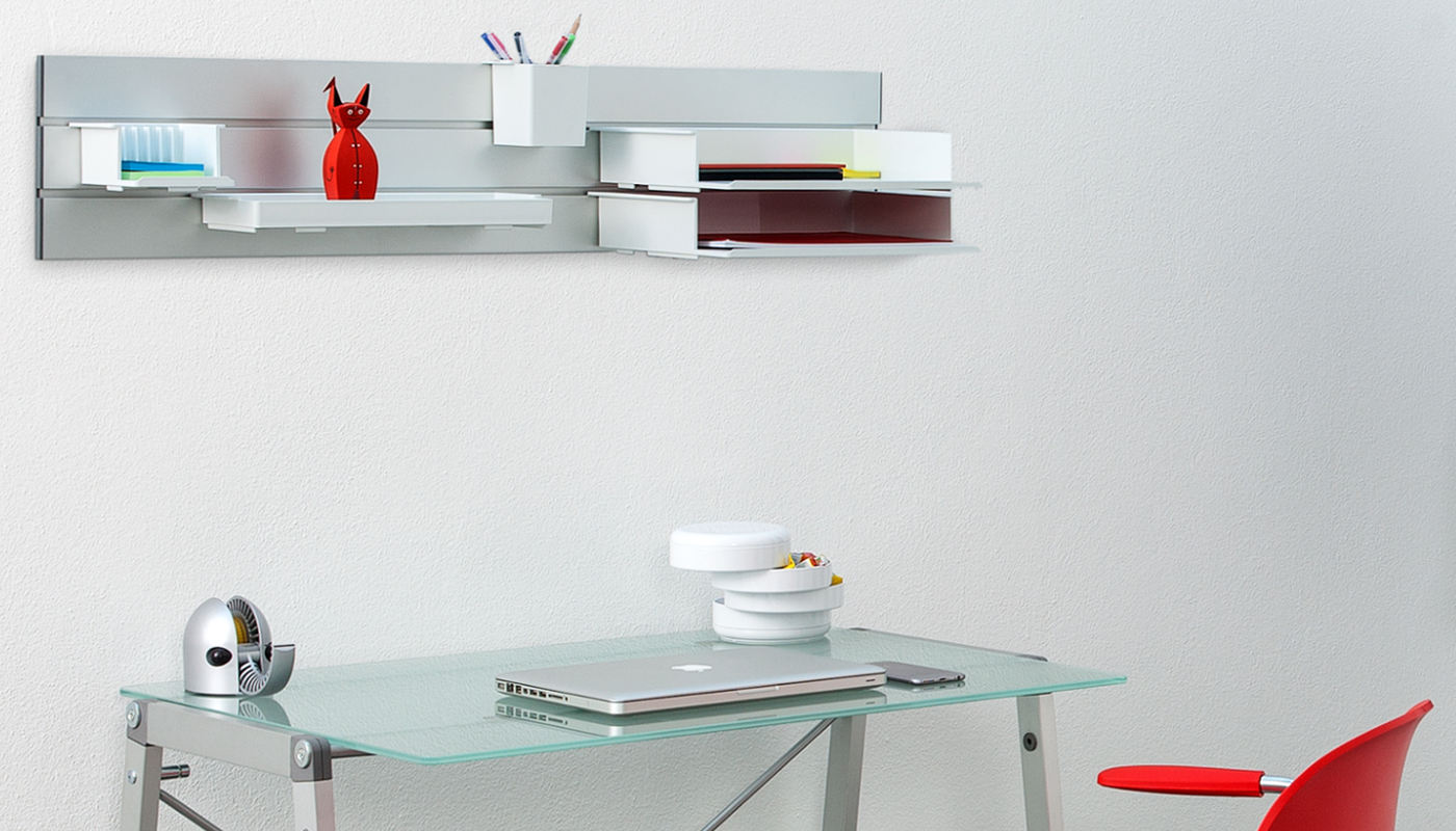 L’utilissimo binario che permette di trasferire a parete l’intero set Standard di accessori da scrivania Rexite.