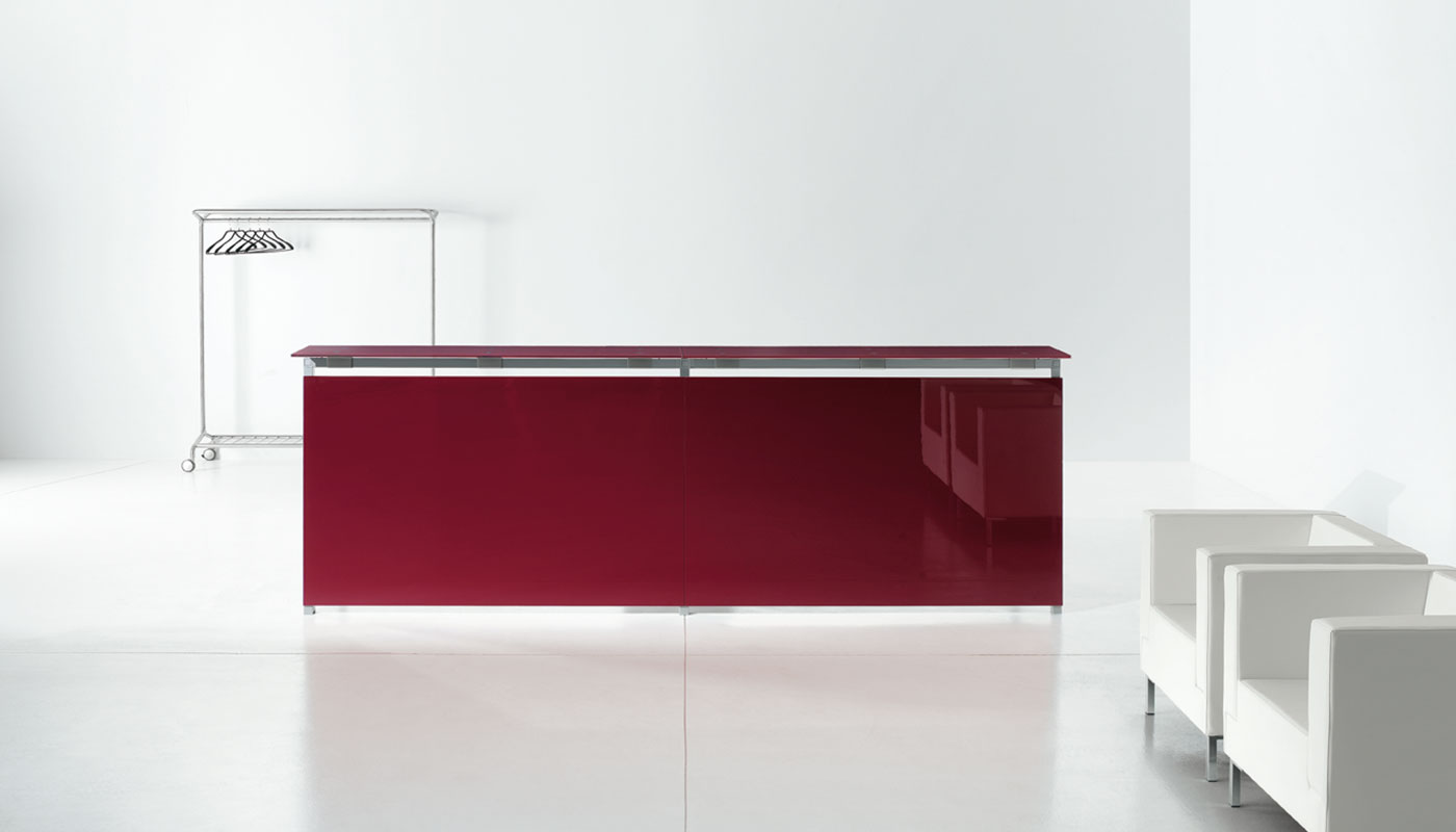 Questa reception di design si distingue per la sua linea rigorosa e minimale, realizzata con materiali di alta qualità che garantiscono un impatto visivo forte e professionale.