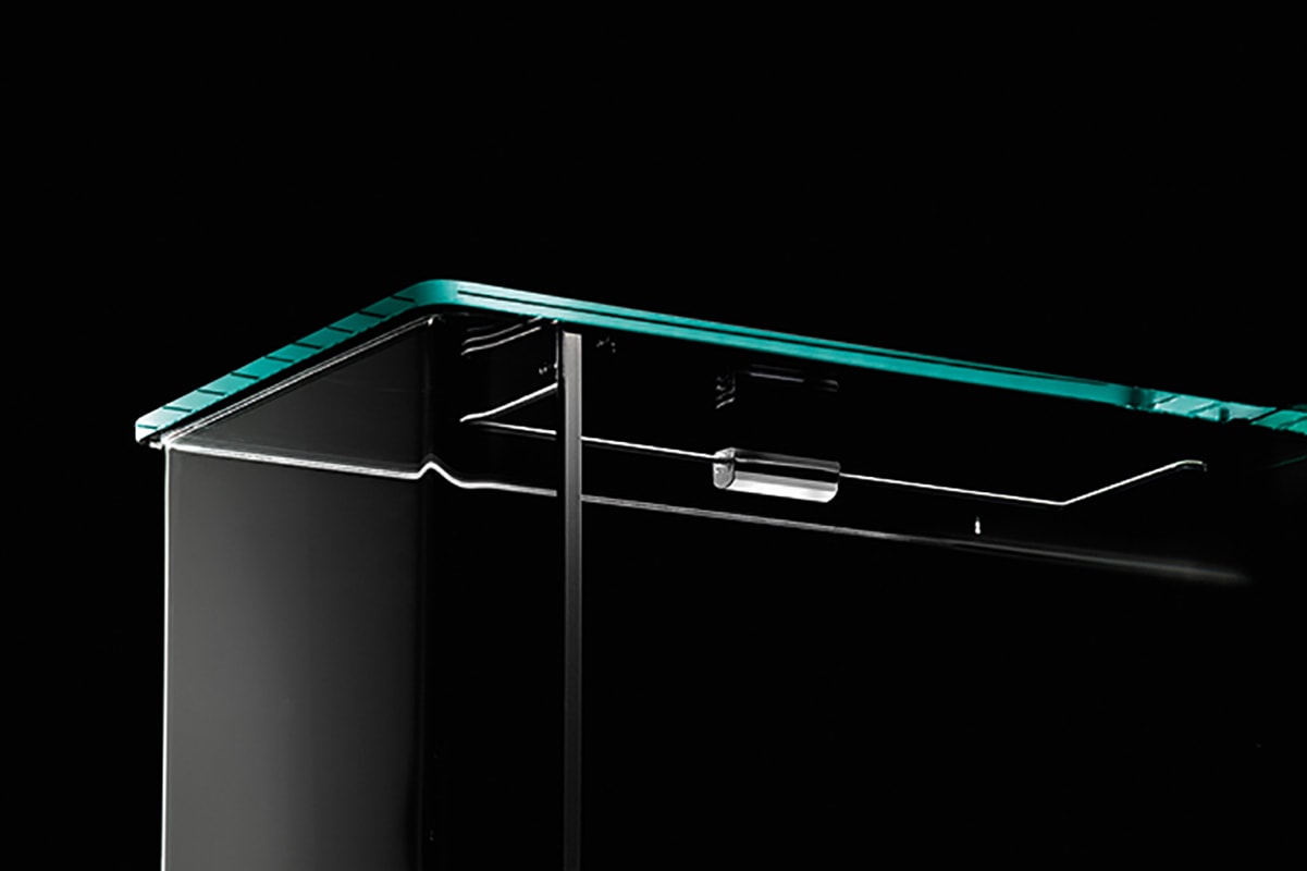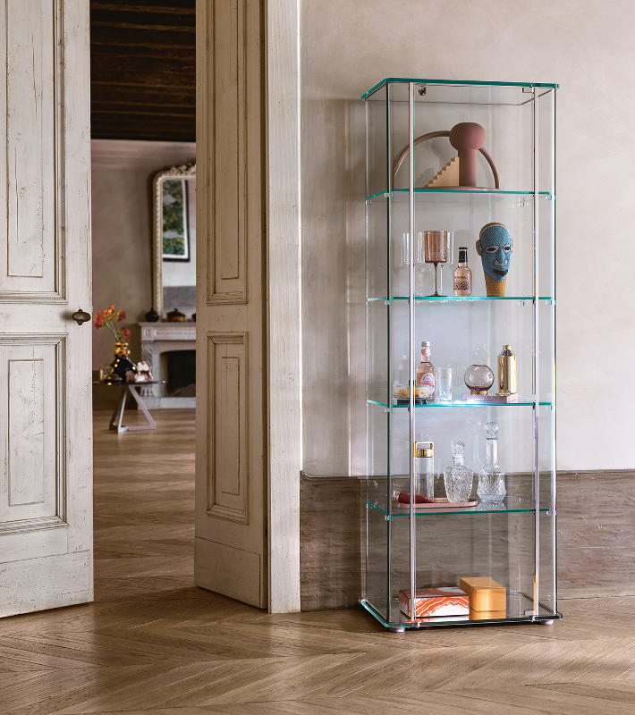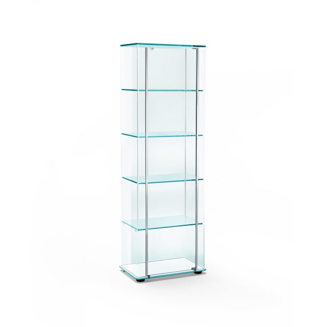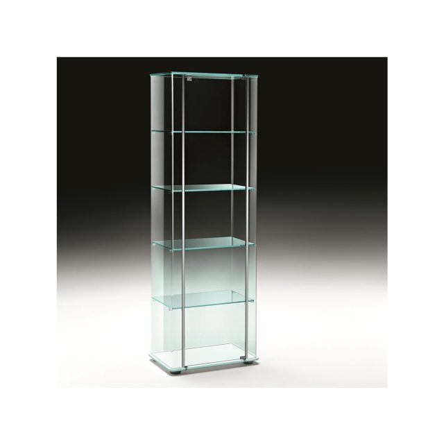Possiede quattro ripiani interni in vetro, fissi, cui si sommano base e top.