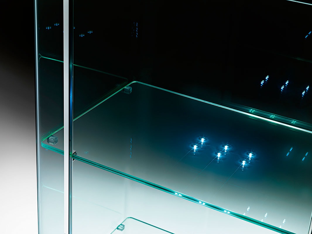 I ripiani interni hanno una portata di venti chilogrammi e sono sostenuti da reggipiano in vetro saldati alla struttura.