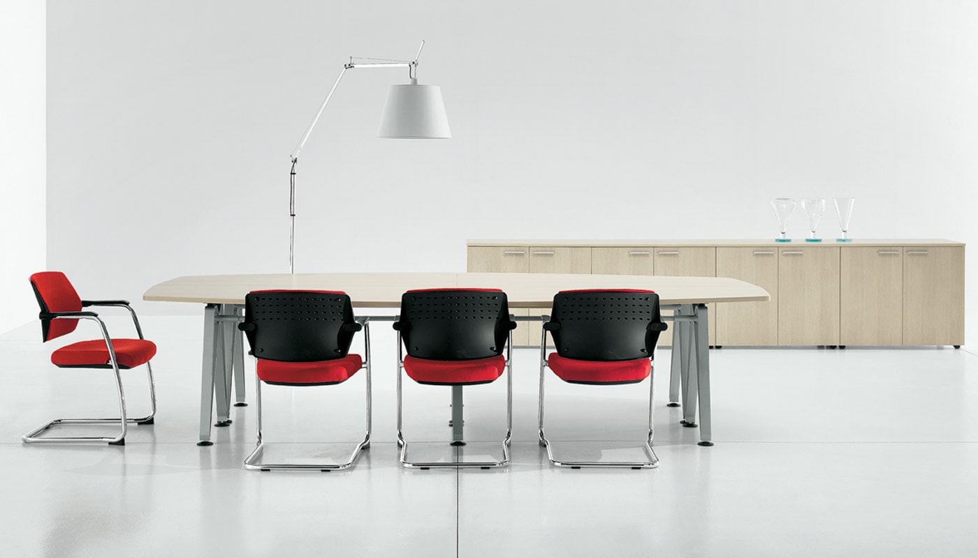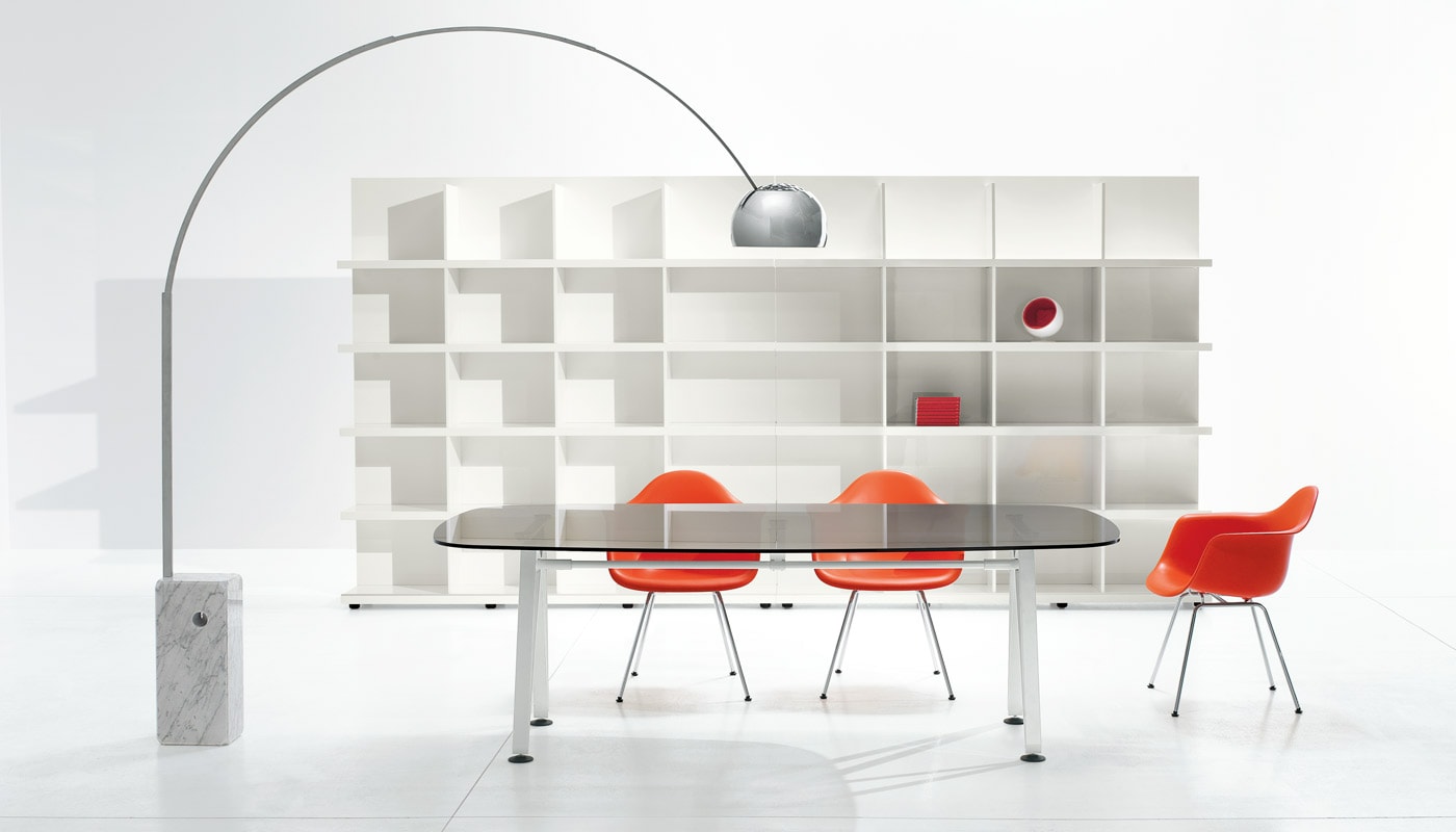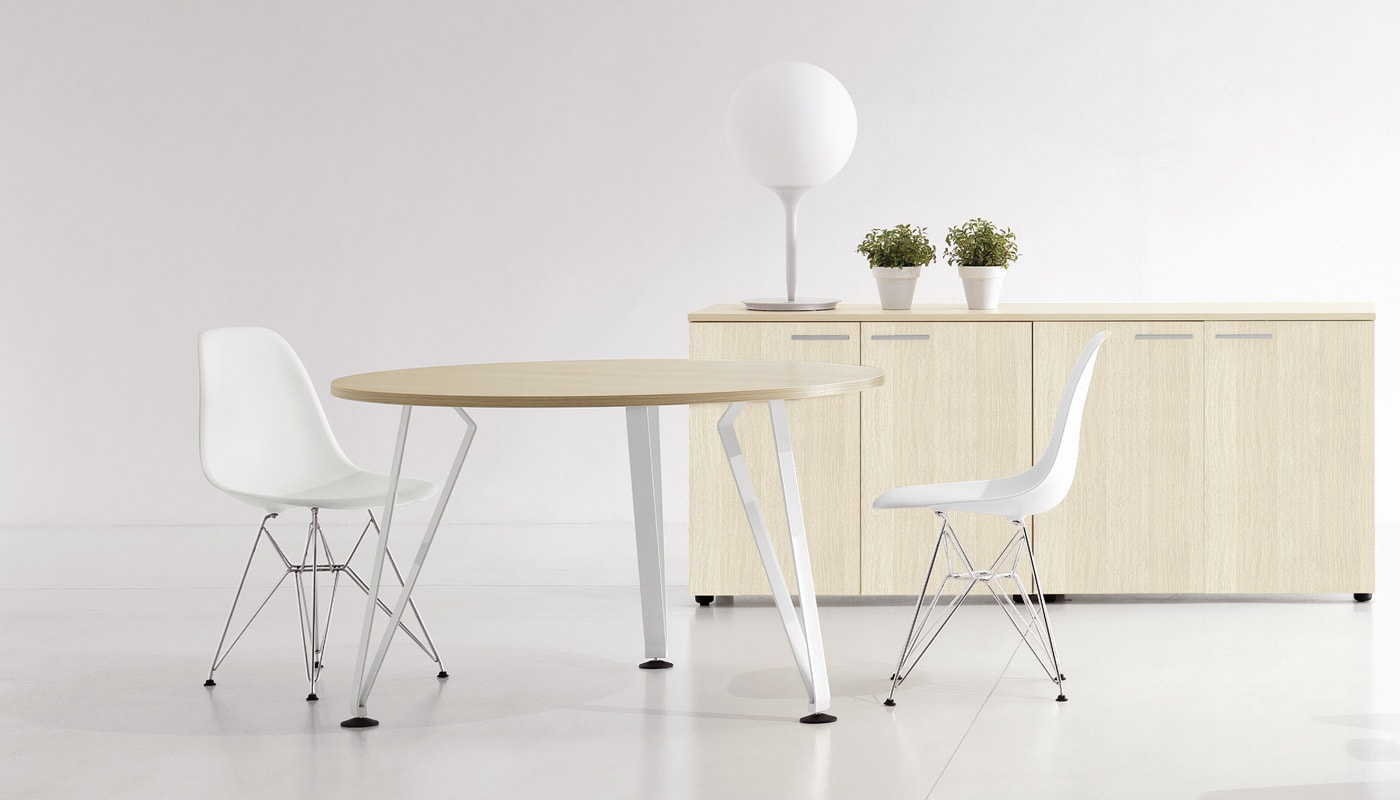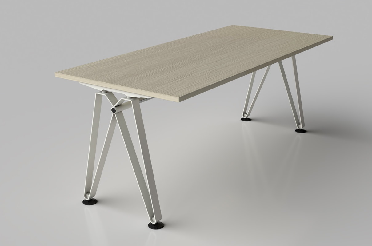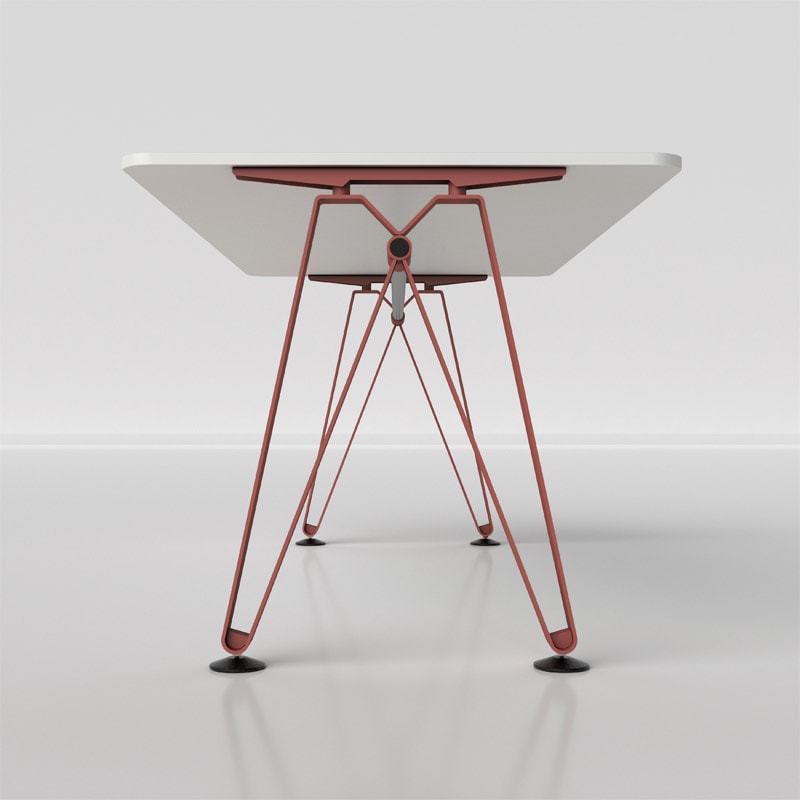 Il tavolo Diagramma di Della Chiara, con il suo stile minimalista, si distingue per la gamba a nastro in metallo verniciato, un’evoluzione moderna del classico cavalletto, che dona carattere e personalità a qualsiasi ambiente di lavoro.