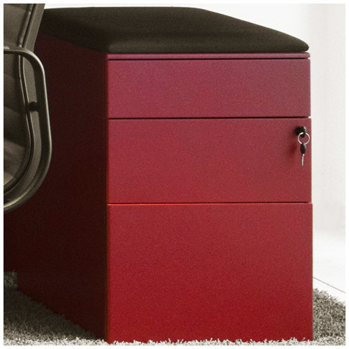 La cassettiera in alluminio LessLess Color è dotata di apertura a pressione e a richiesta può essere accessoriata con un cuscino nero che la trasforma in una comoda seduta.