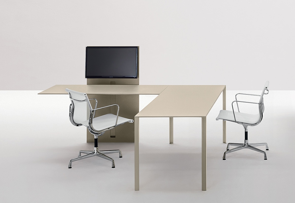Il tavolo direzionale è una struttura in alluminio verniciato con le gambe contraddistinte da un caratteristico profilo a L e il ripiano in Forbo linoleum, che risulta pratico nell’uso e morbido al tatto.