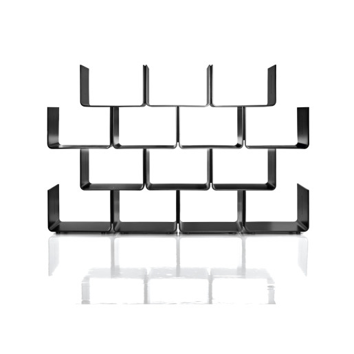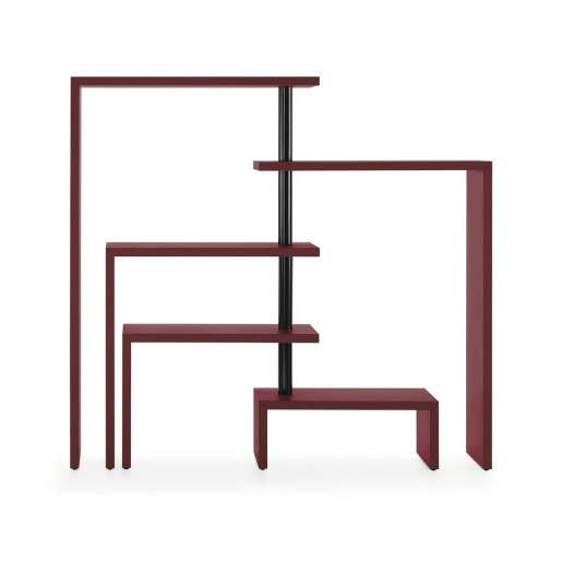 La leggera struttura di ESU Bookcase libreria è composta da una struttura in metallo zincato, corredata pannelli in alluminio verniciato e traforato, ripiani in legno verniciato trasparente, ante scorrevoli in compensato sagomato e sottili strutture metalliche trasversali, in un ardito ed efficace abbinamento.
