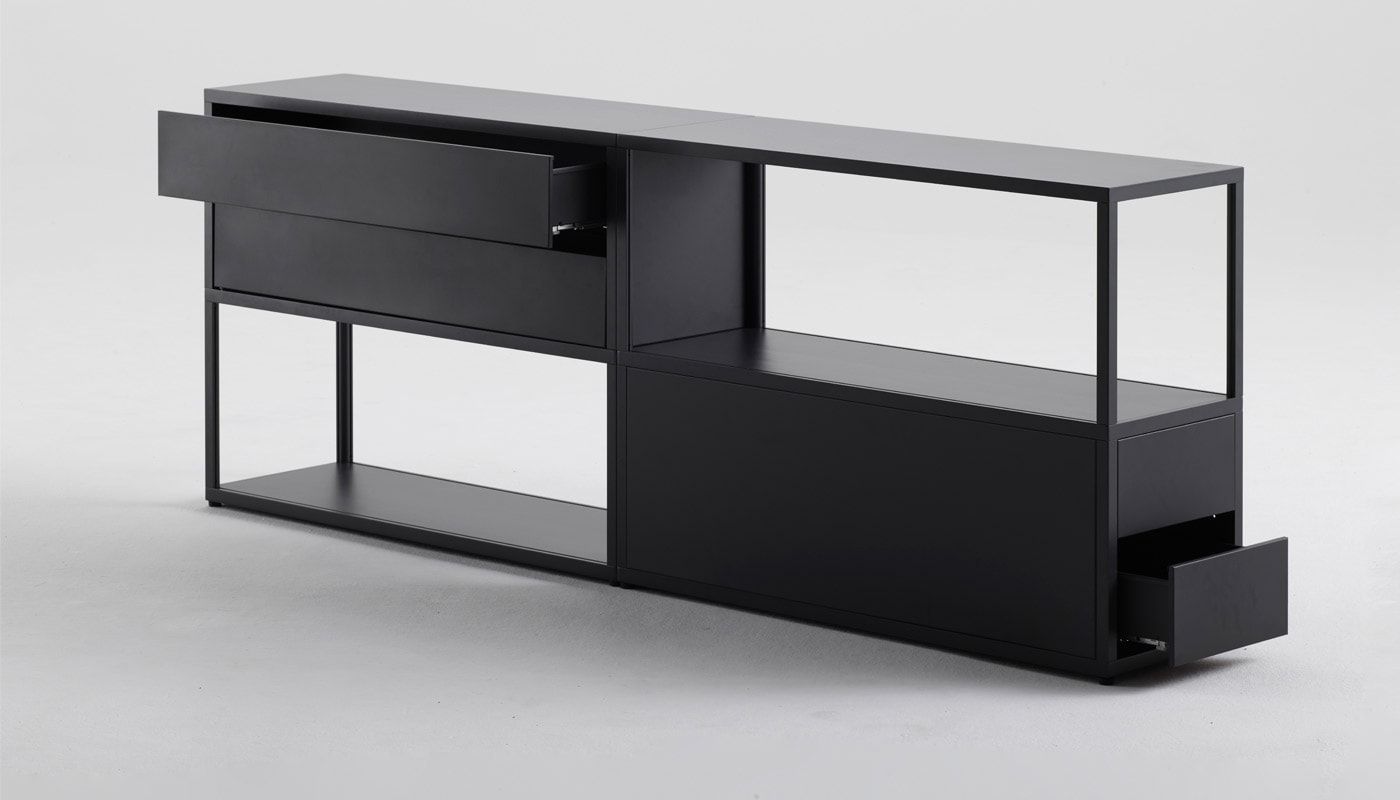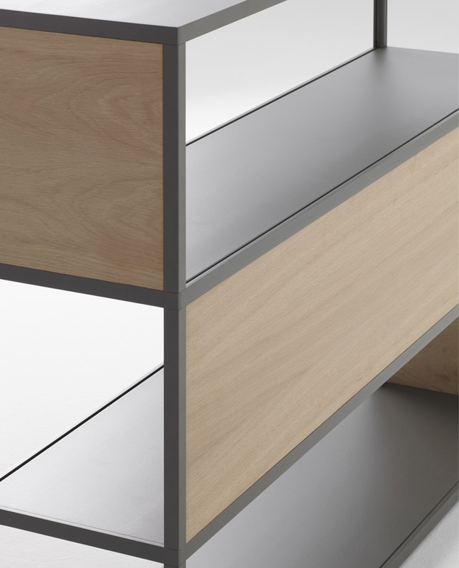 Libreria modulare in alluminio, contenitore aperto o chiuso con ante battenti, scorrevoli, a libro, pannelli posteriori e laterali in legno o acciaio, cassetti, mensole e persino tavoli di diverse altezze, anche con fissaggio a muro, tutto questo è New Order.
