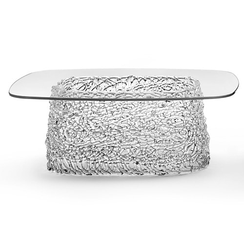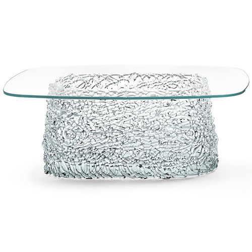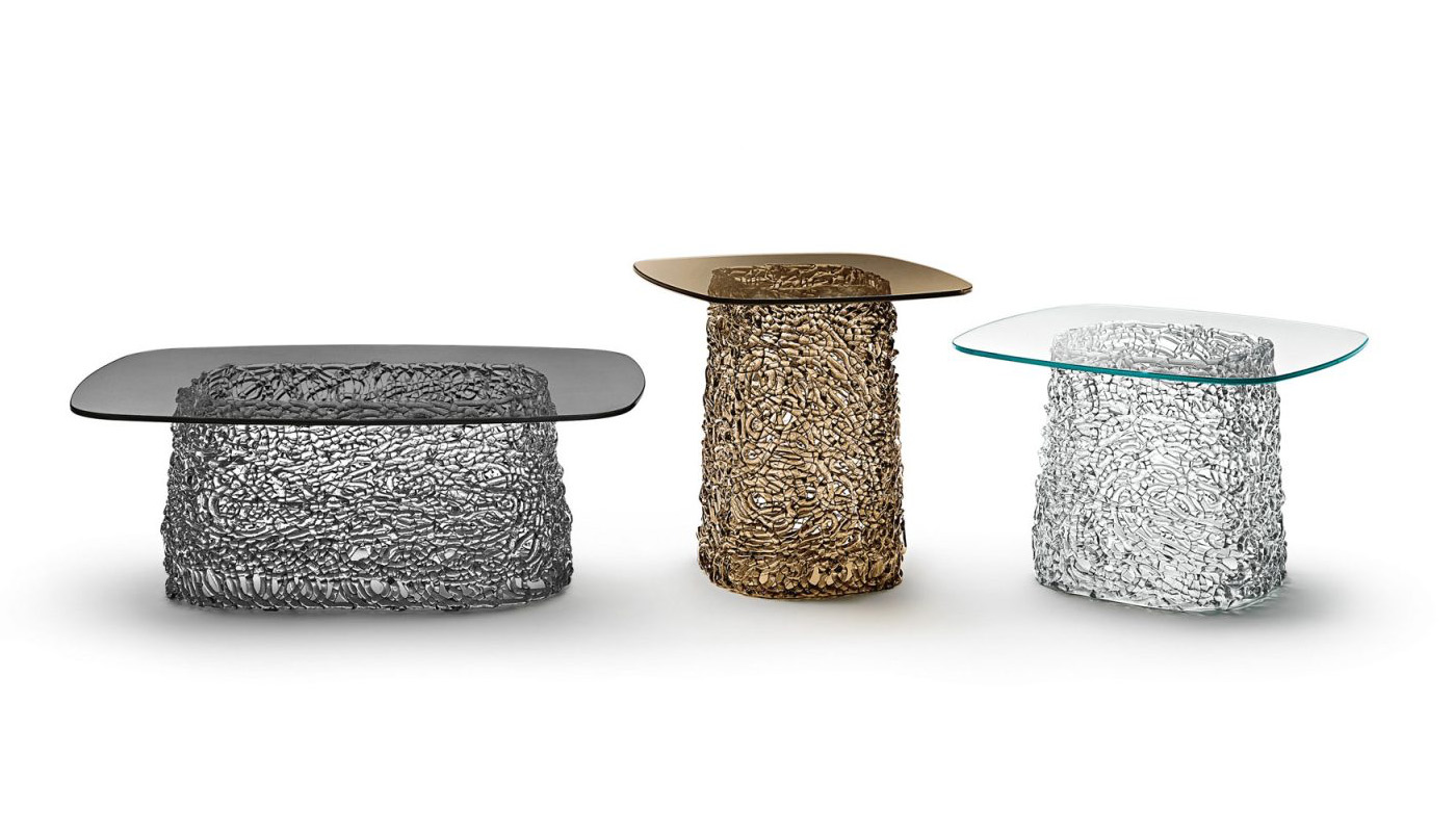 Macramè di Fiam è una collezione di tavolini in vetro proposti in varie finiture e in quattro modelli diversi per dimensioni, tutti caratterizzati dall’affascinante contrasto tra la semplice lastra che fa da ripiano e la tumultuosa base ottenuta annodando ripetutamente il filo di vetro.
