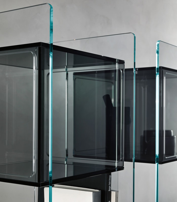 L’effetto è, per l’appunto, magico: in virtù della trasparenza e dell’astrazione geometrica delle forme, i cubi interni appaiono come sospesi, e con essi gli oggetti contenuti, una caratteristica ulteriormente esaltata dalle varie tinte disponibili, che possono dar luogo anche a interessanti bicromie del complesso.