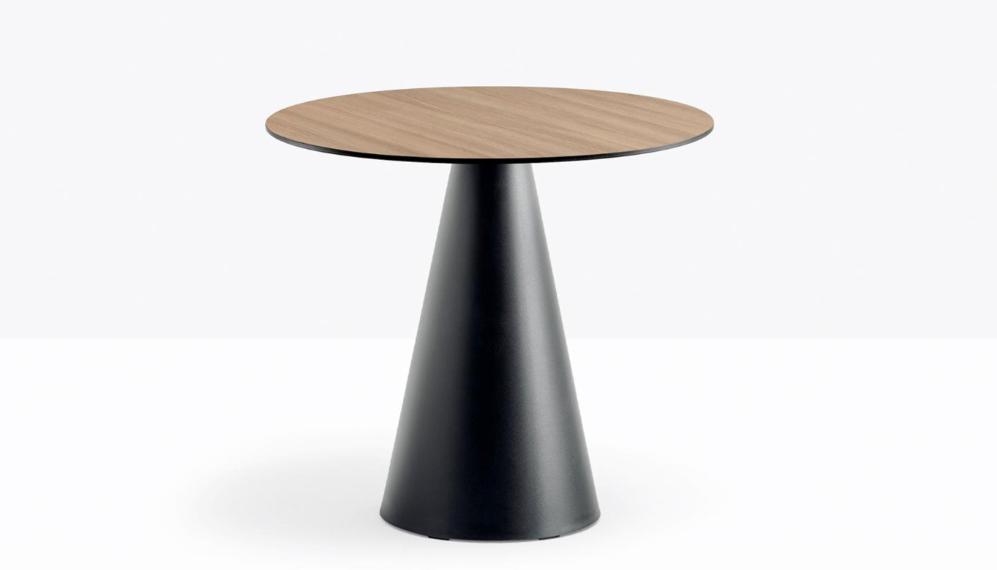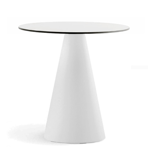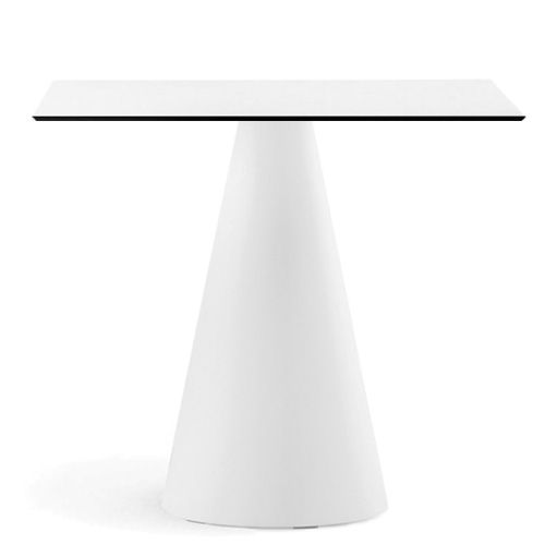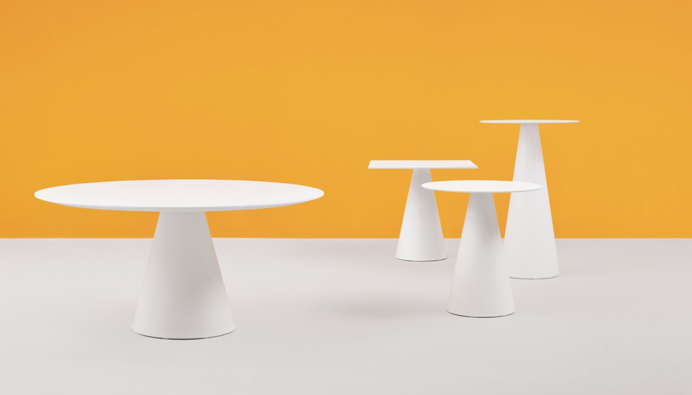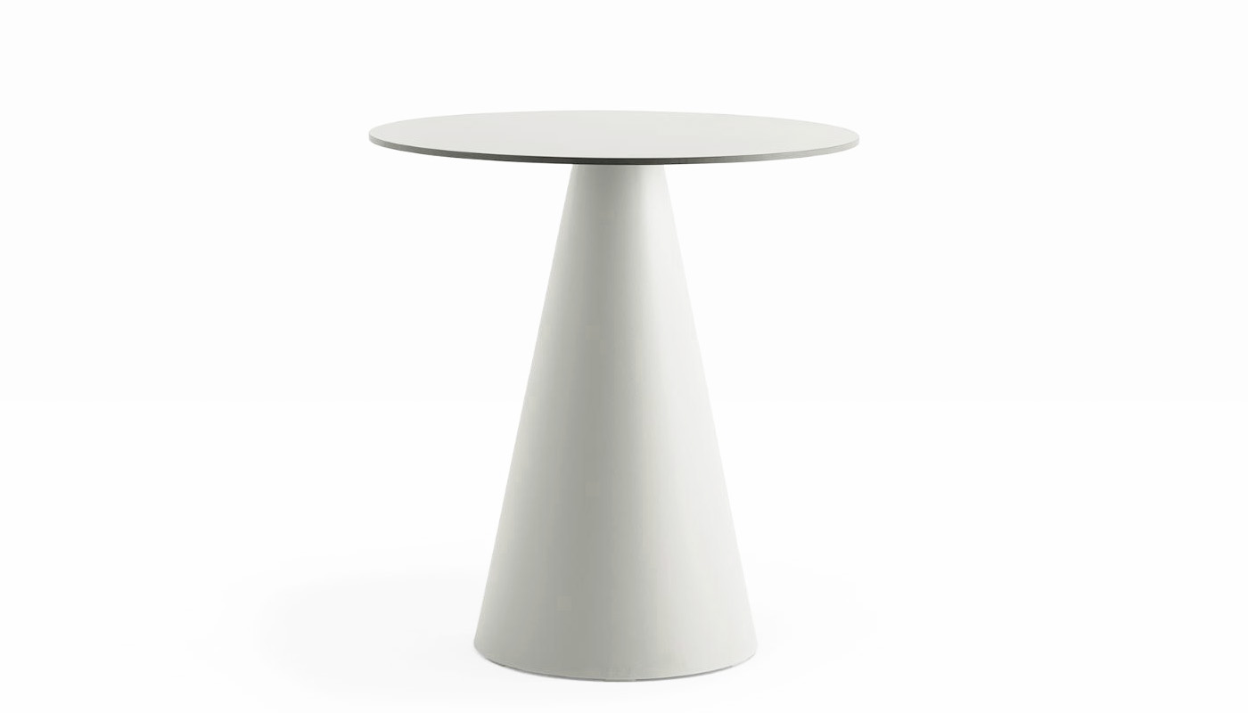 La sua base conica in polipropilene stampato ad iniezione, dalle linee pure e rigorose, richiama un linguaggio architettonico fatto di semplicità e proporzione, conferendo al tavolo una presenza scultorea ma al tempo stesso leggera.