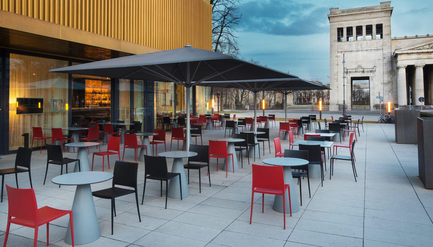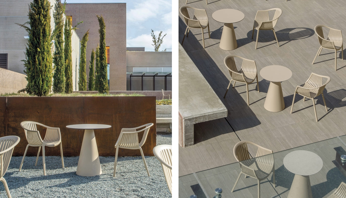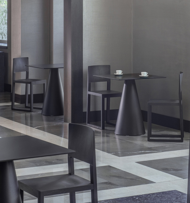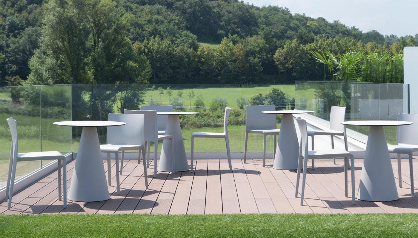La sua base conica in polipropilene stampato ad iniezione, dalle linee pure e rigorose, richiama un linguaggio architettonico fatto di semplicità e proporzione, conferendo al tavolo una presenza scultorea ma al tempo stesso leggera.