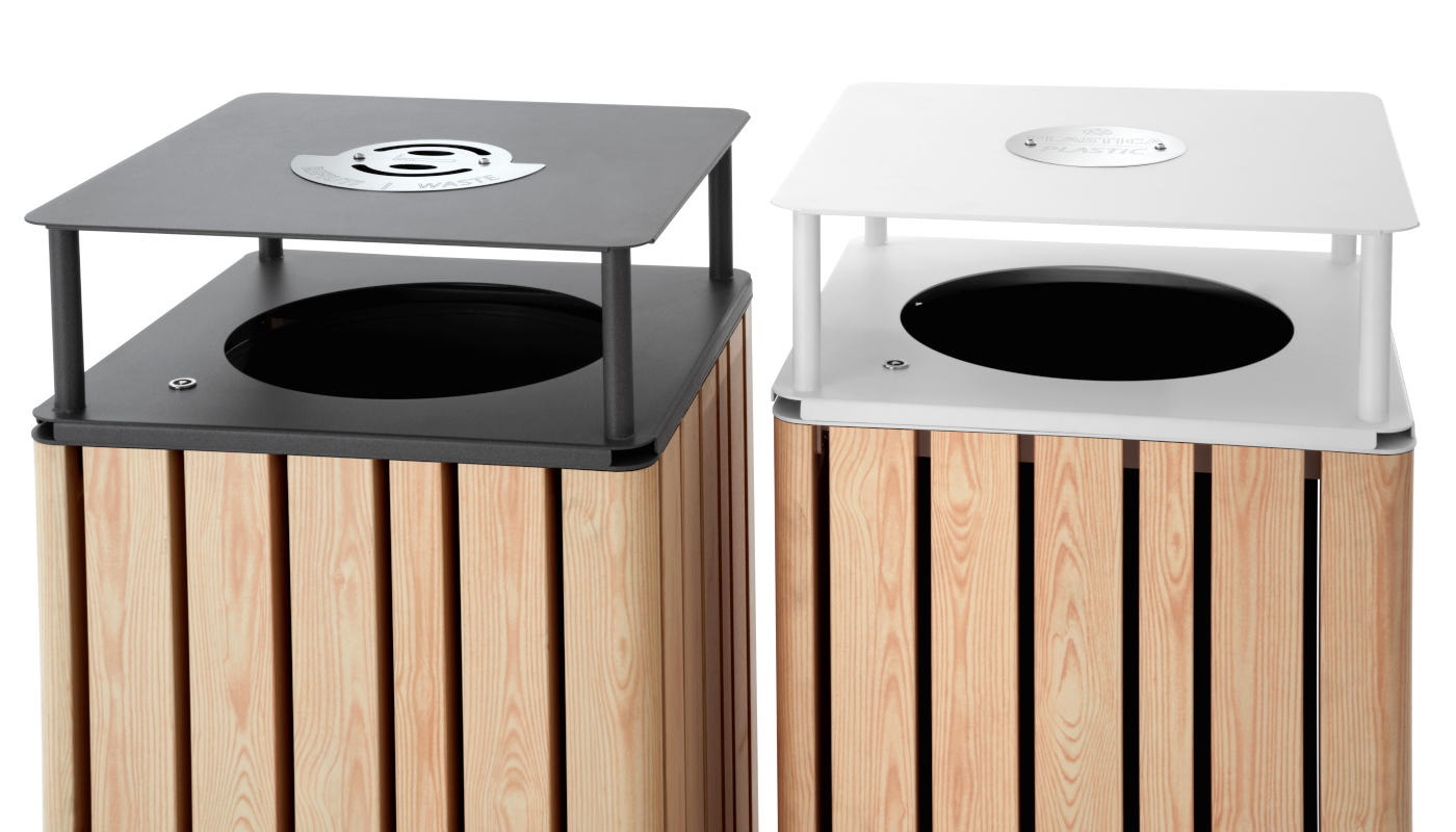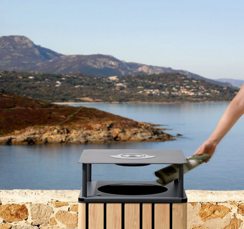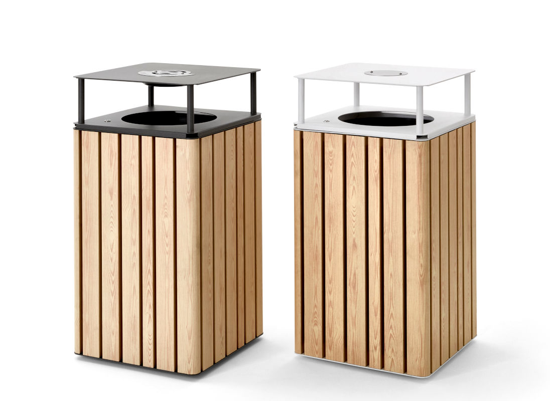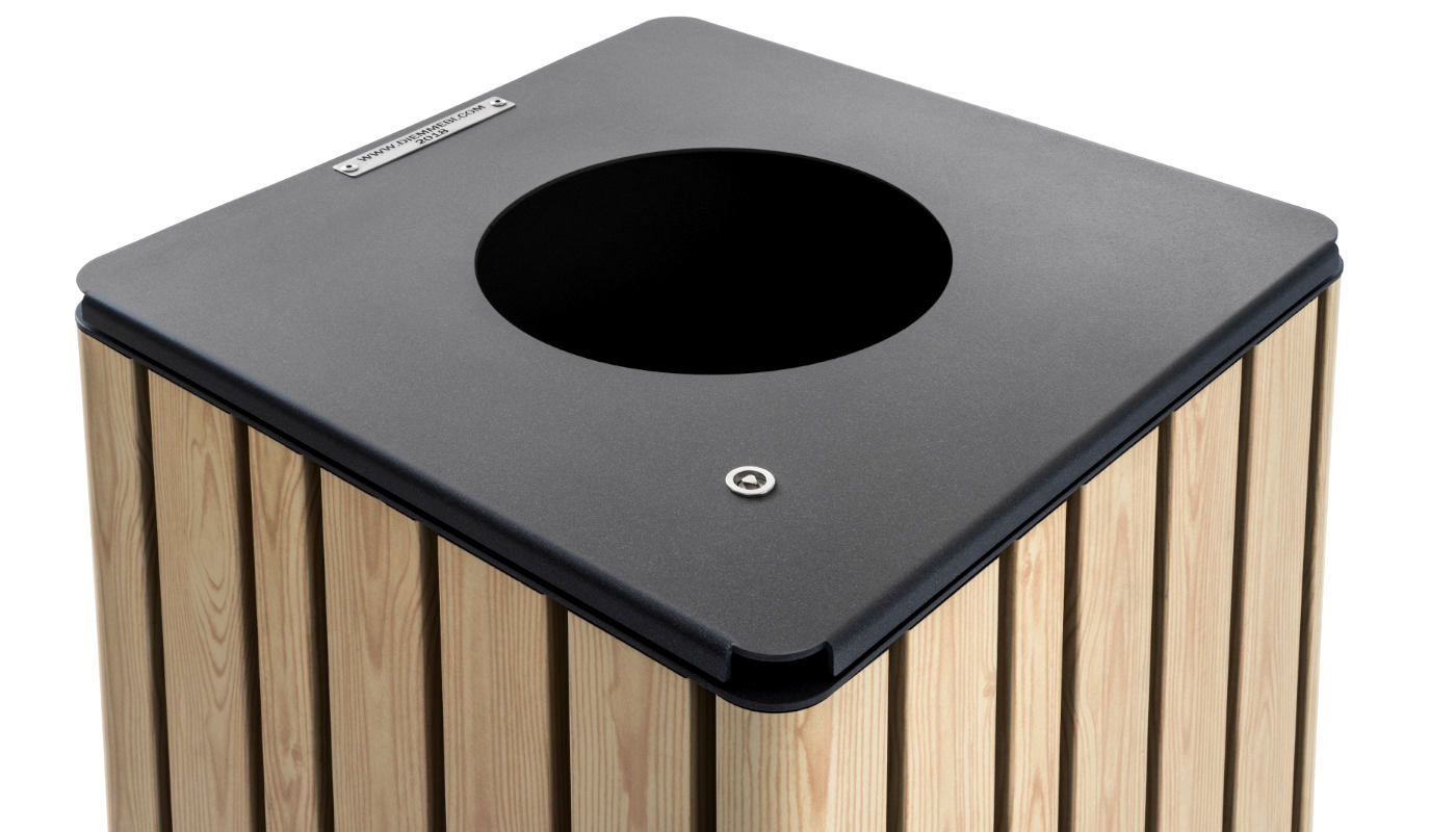 Disponibile in due versioni, cestone standard o cestone con coperchio rialzato, quest’ultimo accessoriabile con etichetta per la raccolta differenziata e posacenere in acciaio integrato.