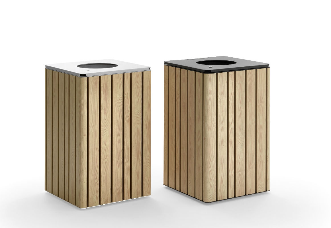 Un contenitore che migliora la qualità degli spazi pubblici e invita a una gestione più consapevole dei rifiuti, con la forza del metallo e l’eleganza del legno.