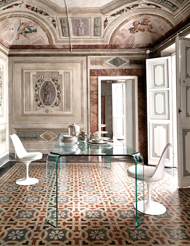 Il tavolo Ragno in vetro curvato di Fiam coniuga rigore, astrazione e stile.
