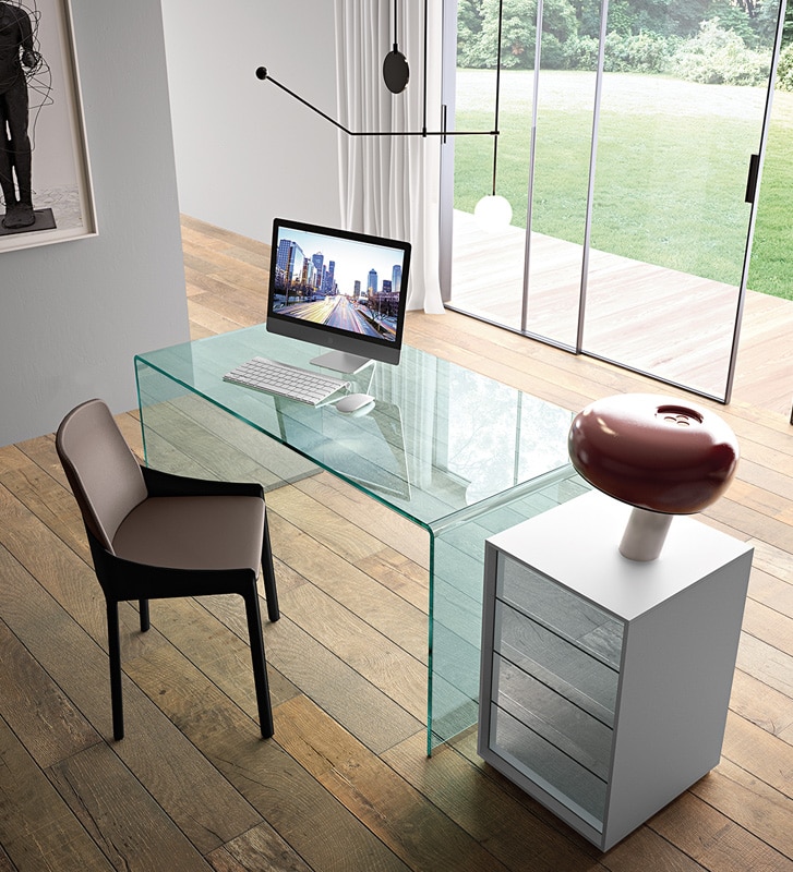 In Rialto di Fiam il minimalismo si fa arte: è una scrivania in vetro curvato talmente pura e astratta da essere solo una figura geometrica, un forma nello spazio in grado di sostenere gli oggetti da lavoro.