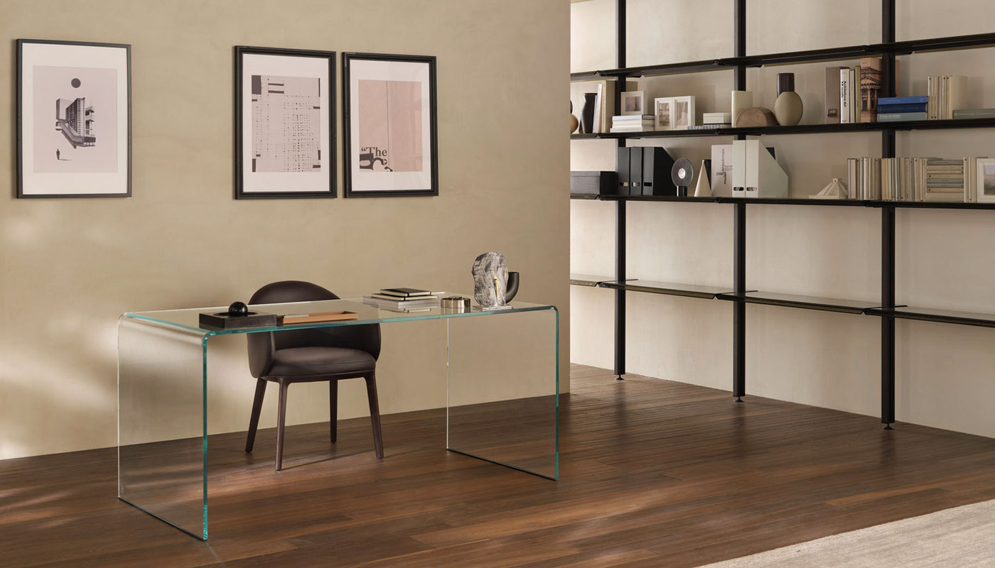 In Rialto di Fiam il minimalismo si fa arte: è una scrivania in vetro curvato talmente pura e astratta da essere solo una figura geometrica, un forma nello spazio in grado di sostenere gli oggetti da lavoro.